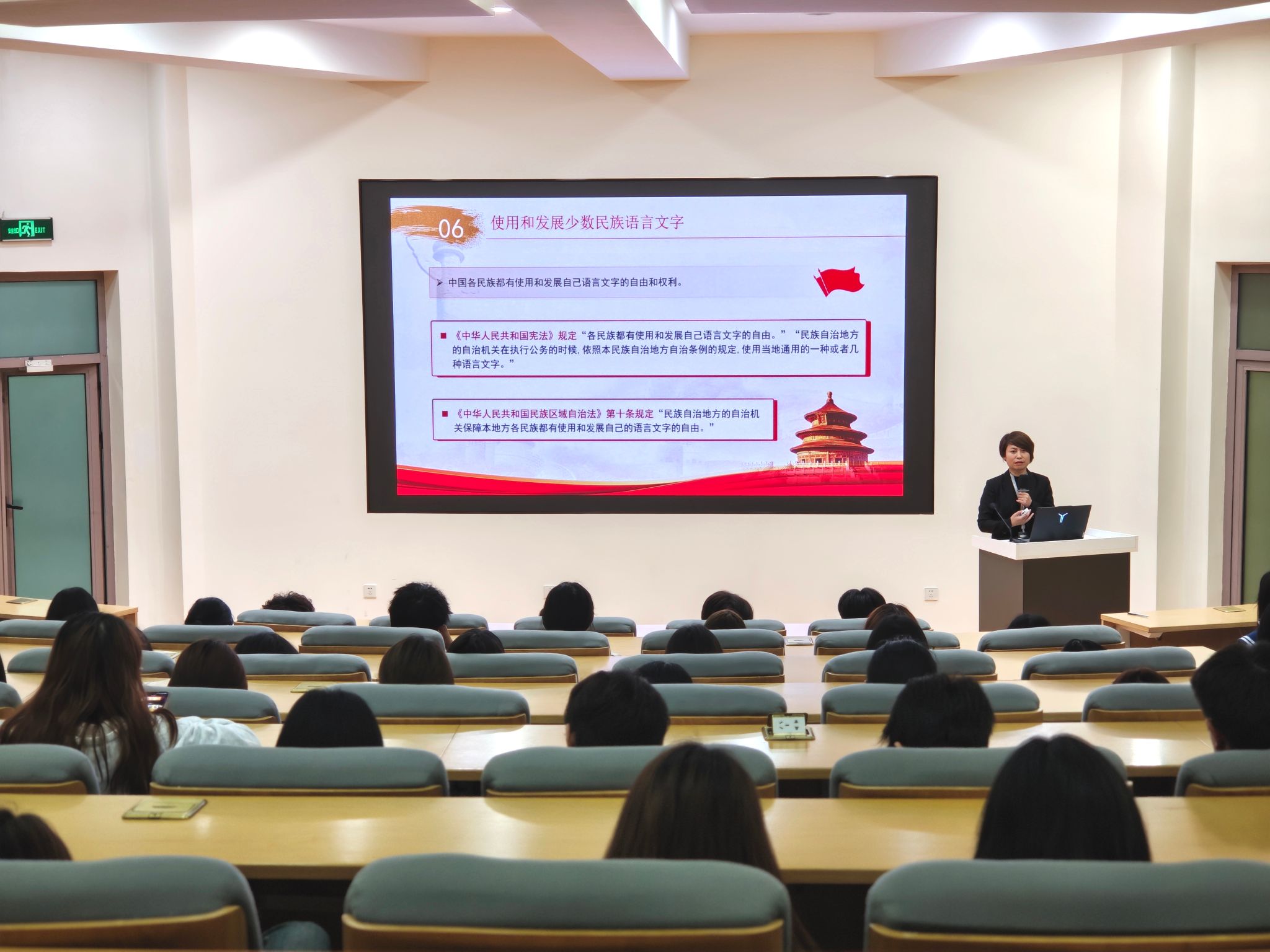 法律依据与现实意义,并结合具体案例,生动阐释了民族平等、民族团结、各民族共同繁荣发展的基本方针。她还从经济支持、文化保护、语言文字使用、风俗习惯尊重以及宗教信仰自由等多个维度,全面介绍了党和国家为推动民族地区发展、保障各民族合法权益所采取的一系列重要举措。