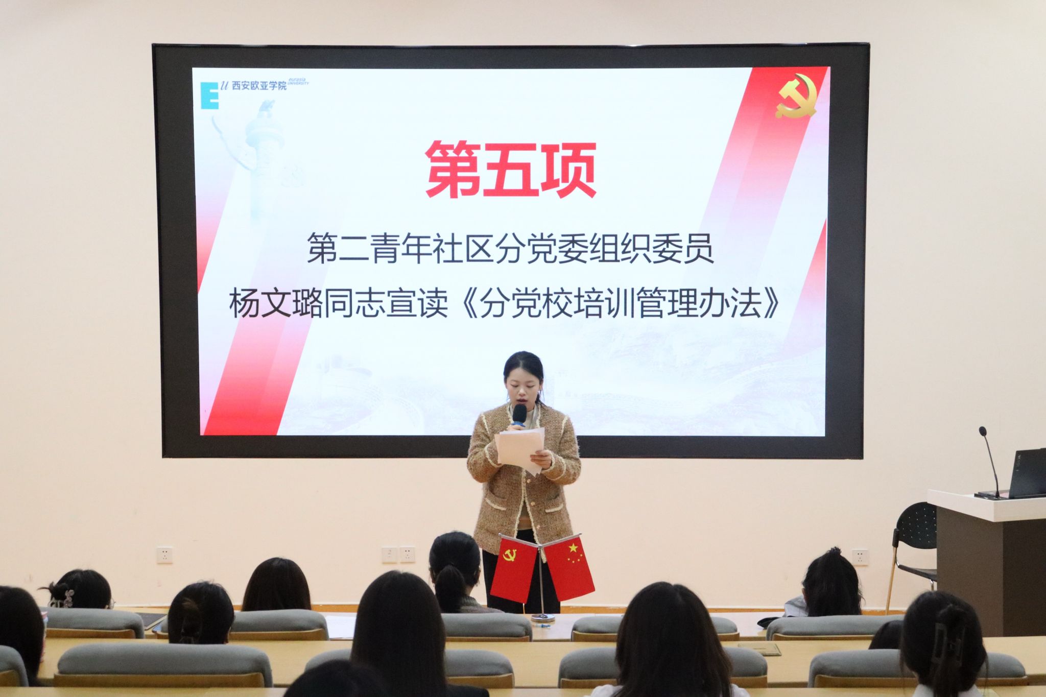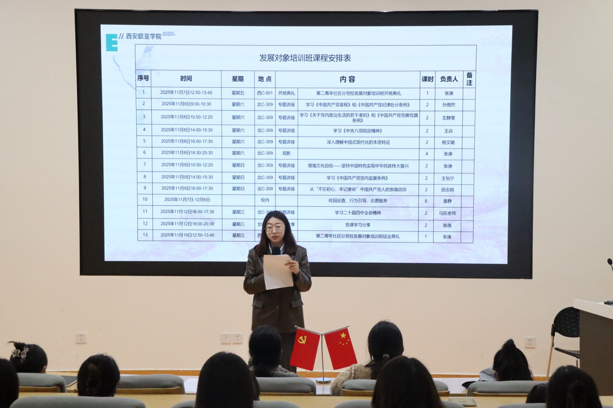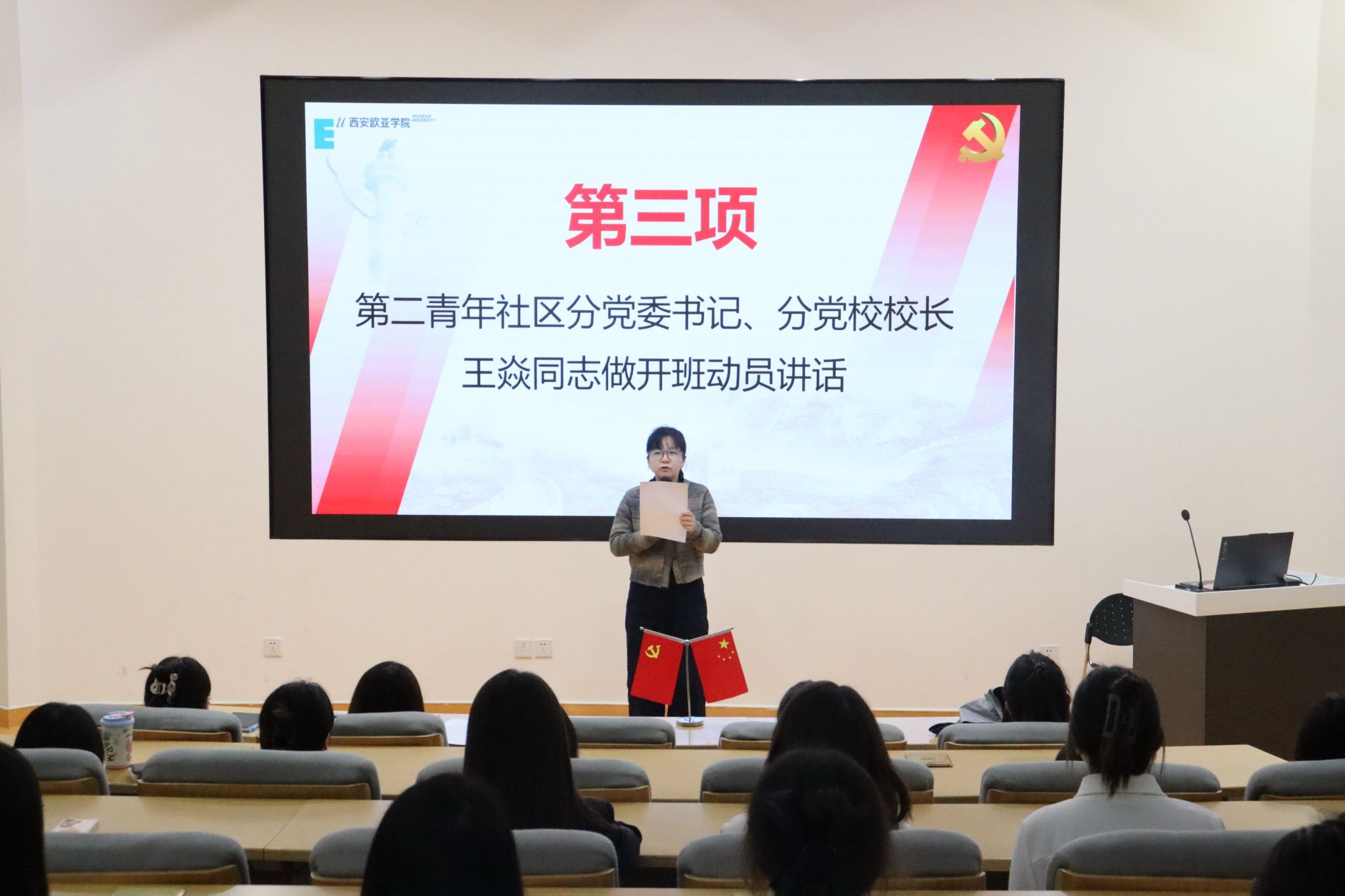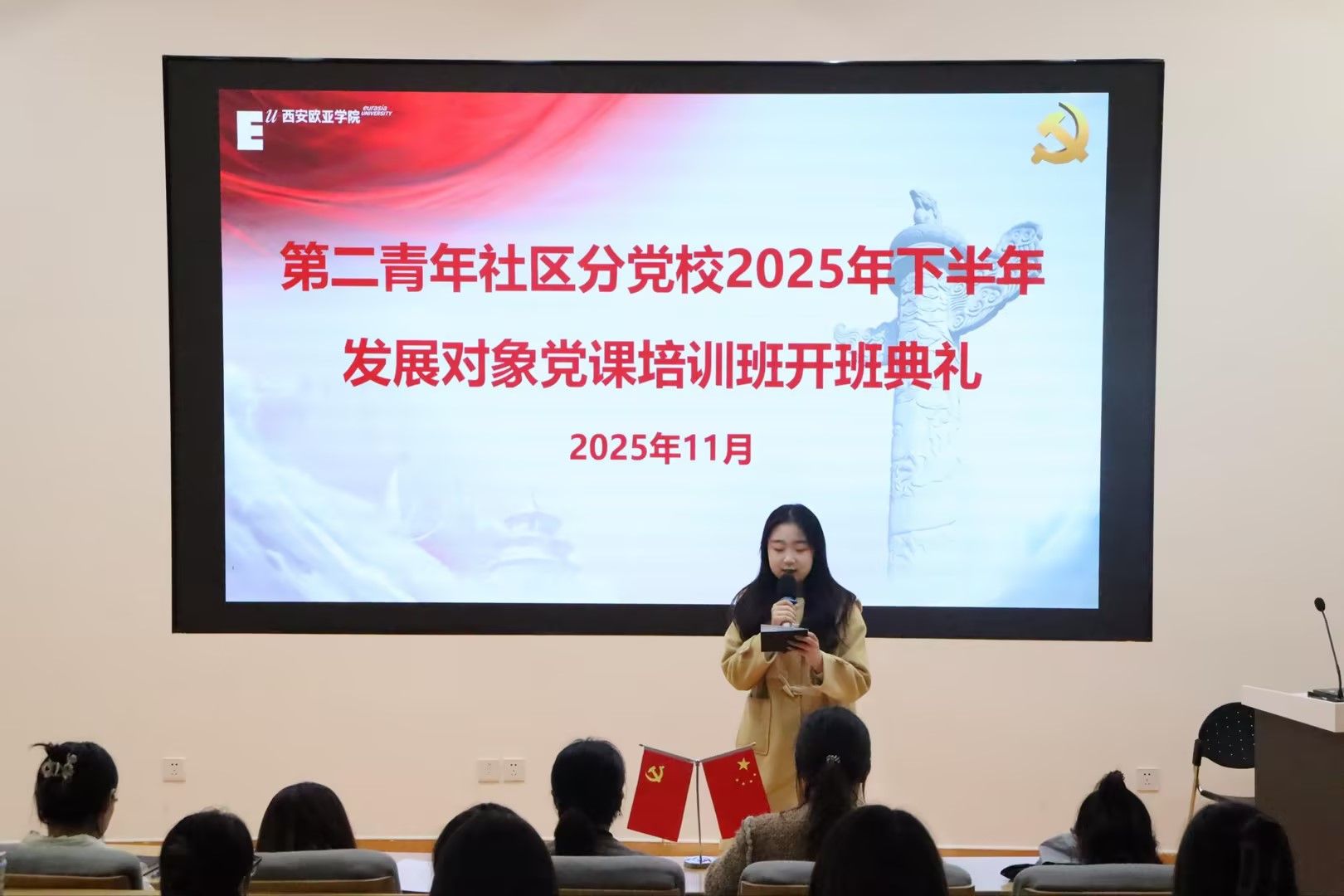 为深入学习贯彻习近平新时代中国特色社会主义思想和党的二十大精神,提高发展对象政治理论水平和党性修养,近日,第二青年社区分党委于11月7日12:50在西C-001举行2025年下半年发展对象党课培训班开班典礼。出席本次典礼的有第二青年社区分党委书记、分党校校长王焱同志,组织委员杨文璐同志,青年委员陈惺惺同志,各学生党支部书记们以及58名发展对象。