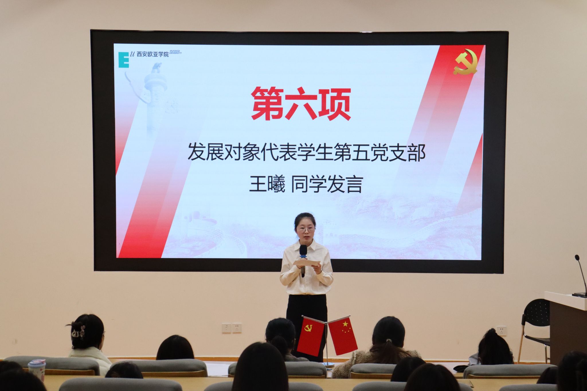 大会第六项,第五支部发展对象代表王曦同学进行演讲,她表示作为入党积极分子代表,向关心培养的党组织及给予指导的领导、老师致谢,通过理论学习与实践,深化对党的认识,坚定入党信念,始终以党员标准要求自己,以培训为新起点,持续努力提升,最后,她号召学员们坚定信念、昂扬斗志、提升自我,争取早日达到一名合格共产党员的标准,为实现中华民族伟大复兴的中国梦贡献。