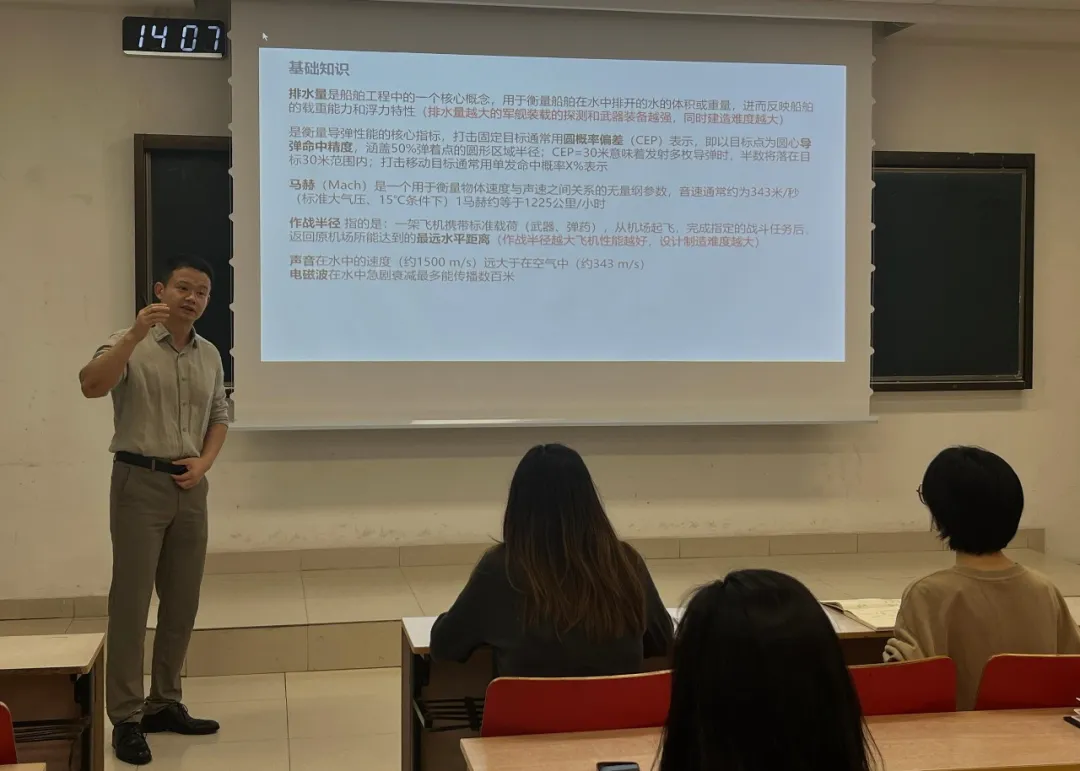 分享会上,梁老师以《大阅兵讲解》为蓝本,系统梳理了古今中外阅兵的历史演变,并结合我国近年来在国防和军队现代化建设方面取得的重大成就,详细解读了陆上、海上、防空、信息、无人、战略打击及空中作战等多个方队的装备体系与发展脉络。他从“排水量”“马赫”“作战半径”等基础军事概念入手,深入浅出地阐释了现代军事科技的核心指标与战略意义。