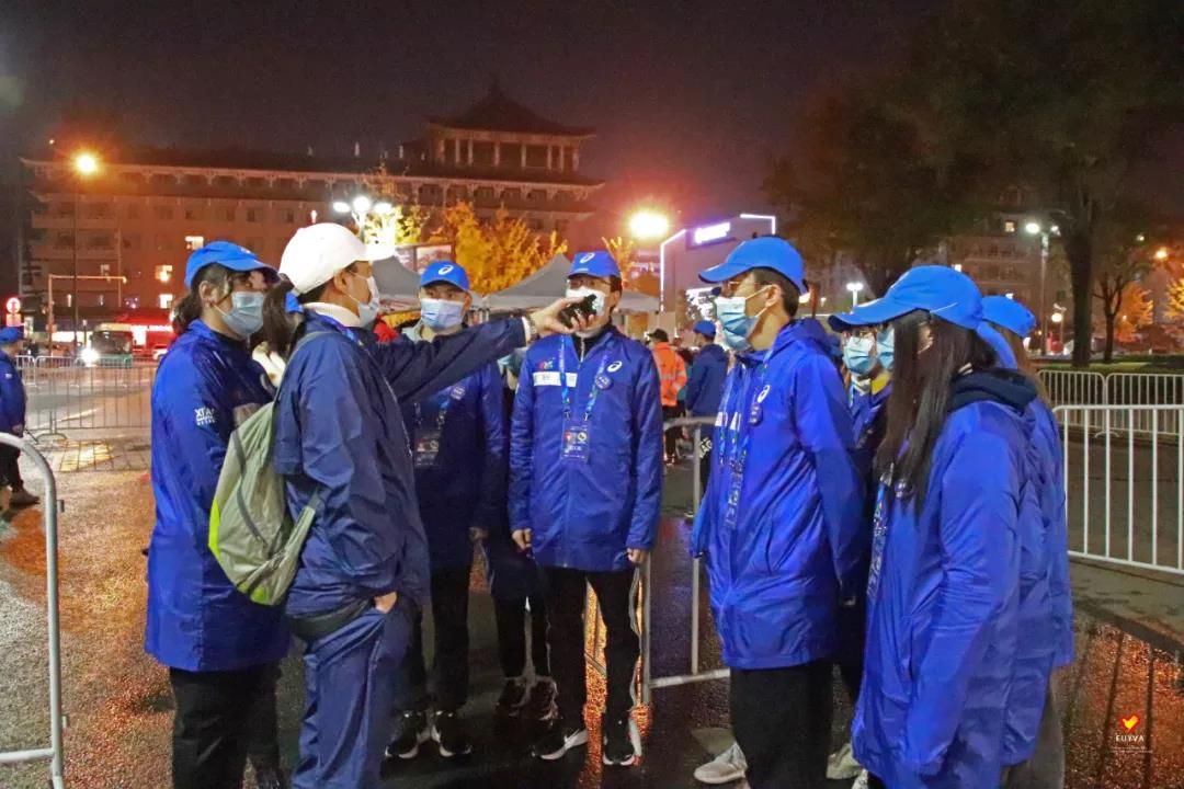 在马拉松的起点上,志愿者在自己的岗位上待命