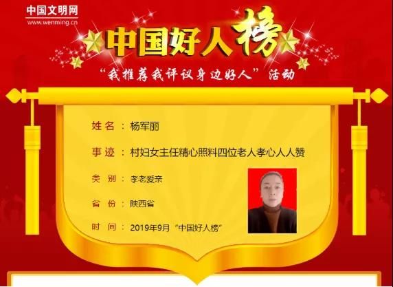杨军丽是陕西省大荔县两宜镇南贝村妇女主任、村医。杨军丽在家中排行老二,上有哥哥,下有妹妹,父母都将近八十,还有一个80多岁的瞎子伯(父亲的哥哥)要照顾。哥哥常年在西安工作,妹妹于2013年遭遇一场车祸,不幸去世。生活中她既要行医看病,参与村上各项工作,又要照顾老人的饮食起居,事情繁多,压力山大,但她从未抱怨,始终用一颗感恩之心,面对生活。