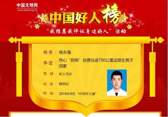 2018年6月20日晚10时许,杨永强驾驶陕CT9606出租车进秦岭接客人,在距离宝鸡市区十几公里的大散关附近时,突然发现前方一名男子提着包独自行走在公路上,并且神态有点异常。经询问,该男子从宝鸡火车站徒步6个多小时走到秦岭大散关附近,现在已身无分文,准备步行回到老家甘肃康县。通过交流,还发现这名男子神志不清,疑似有智力缺陷。于是杨永强同志便驾车将该男子送回家。