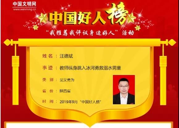 汪德斌是陕西省平利县城关第二小学教务主任。2019年3月19日,汪德斌在下班途中,在河滨路景观桥附近偶遇落水儿童,千钧一发之际,他毫不犹豫跳入冰冷的河水中,最终,警民携手把一条幼小生命从死神手里抢了回来。他英勇救人的事迹刷爆了朋友圈,引起了大家的纷纷点赞,网友都称赞他为“最美老师”。在教师生涯中,他把学校的贫困学生、留守孩子、特殊学生当作自己的孩子,关心他们的生活和学习,还曾帮助感染了血吸虫病的孤儿学生得到免费医疗救助并转危为安。