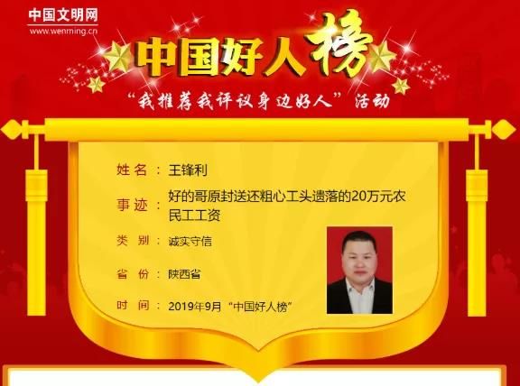 王锋利是陕西省西安市西汽集团中北公司出租车驾驶员。2018年12月7日,包工头李先生刚取的准备给农民工发工资的20万元现金,却不小心丢在出租车上。出租车司机王锋利同志在驾车离开1公里后发现了后排座位上一个黑色塑料袋里面放着20沓现金,他立即开车返回李先生下车的地方找人,在没找到失主的情况下赶紧给车队打电话报备。而且之前开车遇到三轮车着火,王师傅会下车救火,还经常免费拉载80岁以上的老人,参与公益活动。