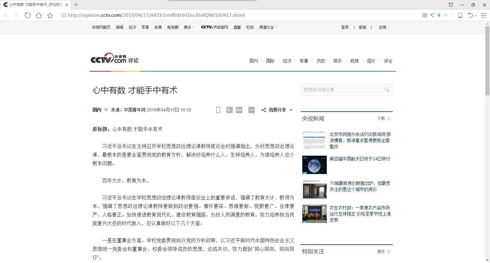 2019年4月17日,beat365手机版官网党委书记于孟晨在《中国青年网》发表《心中有数 才能手中有术》文章,总结学校贯彻习近平总书记在学校思想政治理论课教师座谈会重要讲话精神的经验做法,并被央视网转载。原文如下: