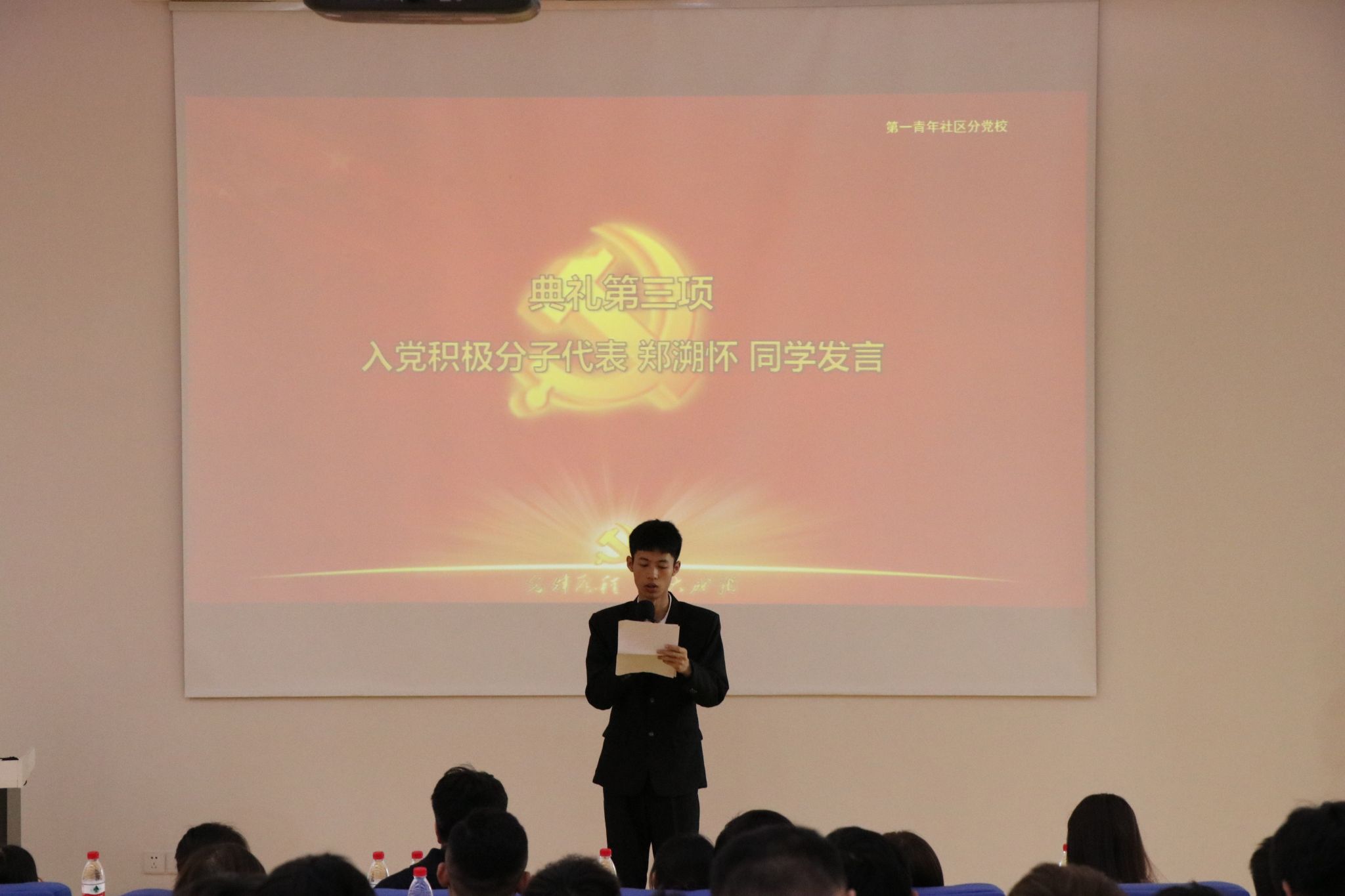 会上,入党积极分子代表郑溯怀同学分享了入党的初心以及成为一名合格党员所要做的努力。他表明他将时刻以一名共产党员的标准严格要求自己,进一步端正入党动机,在学习中争先创优,起好的模范带头作用,认真参加党课学习,积极汇报思想。