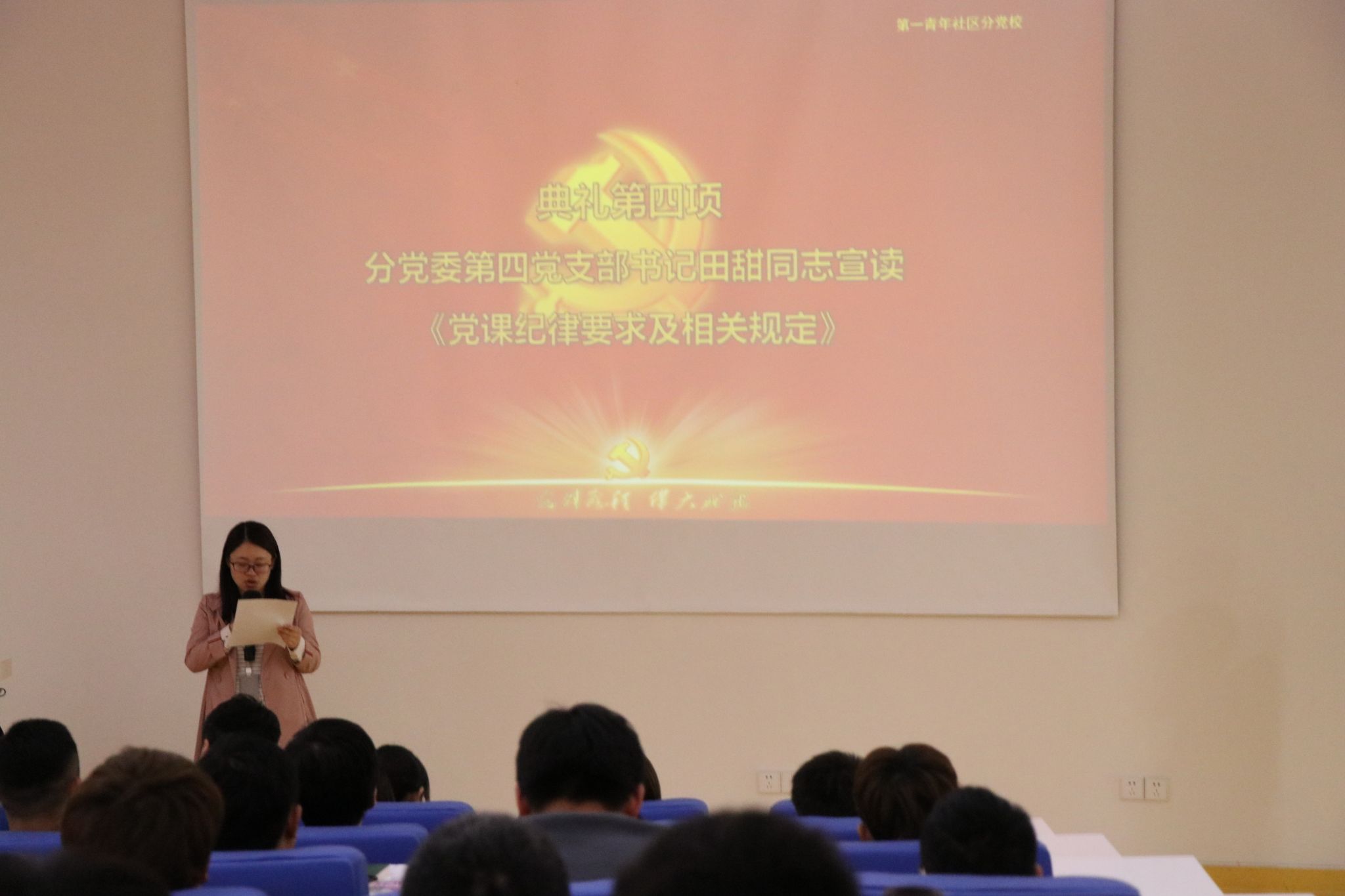 会上,分党委第四党支部书记田甜同志宣读《党课纪律要求及相关规定》。她强调入党积极分子要加强对党的认识和理解,坚定跟党走的理想信念,真正牢固树立为实现中华民族伟大复兴中国梦而奋斗的远大理想。并从认真学习,涵养党性;筑牢信念,对党忠诚;担当作为,知行合一三方面对学员提出希望和要求。