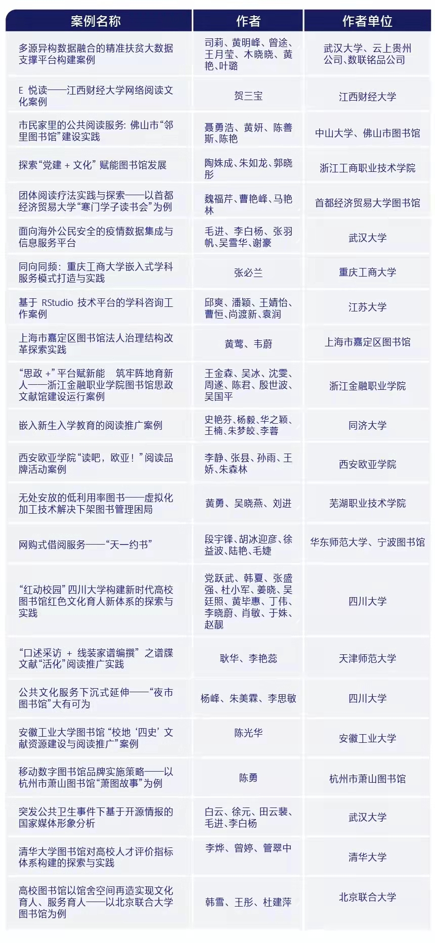 日前,由全国图书情报专业学位研究生教育指导委员会主办,四川大学公共管理学院承办,武汉大学信息管理学院、武汉大学信息资源研究中心、南开大学商学院信息资源管理系协办,北京华图新天科技有限公司支持举办的“2021年全国图书情报案例学术研讨会暨图书情报创新案例大赛”顺利举办。经过专家评审,本届大赛共有31篇图情方向的教学案例和工作案例获奖。获奖案例现已在全球案例发现系统上线,供全国图书情报相关机构进行教学与工作研究。