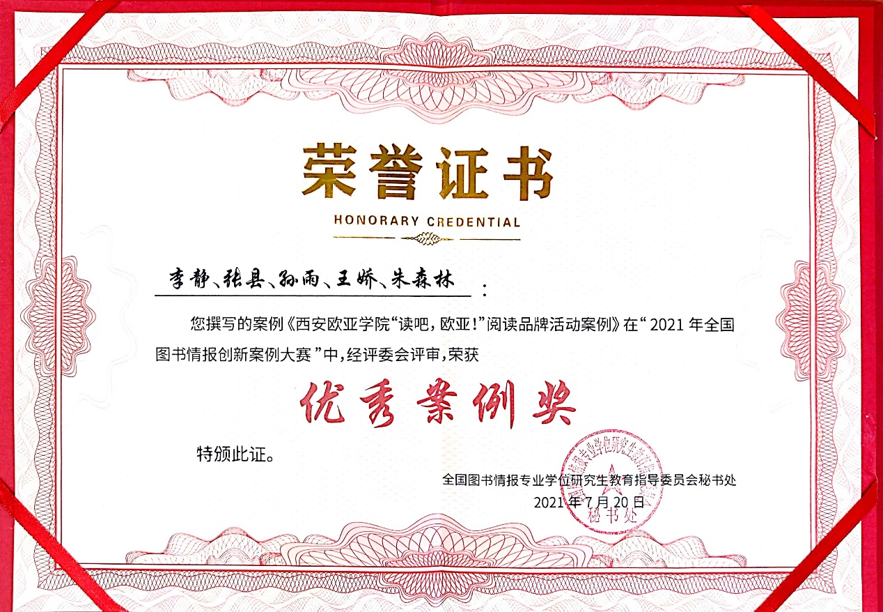 beat365图文信息中心李静、张县、孙雨等提交的《“读吧,欧亚!”阅读品牌活动》案例获得2021年全国图书情报案例学术研讨会暨图书情报创新案例大赛优秀案例奖,也是此次获奖的唯一民办高校。