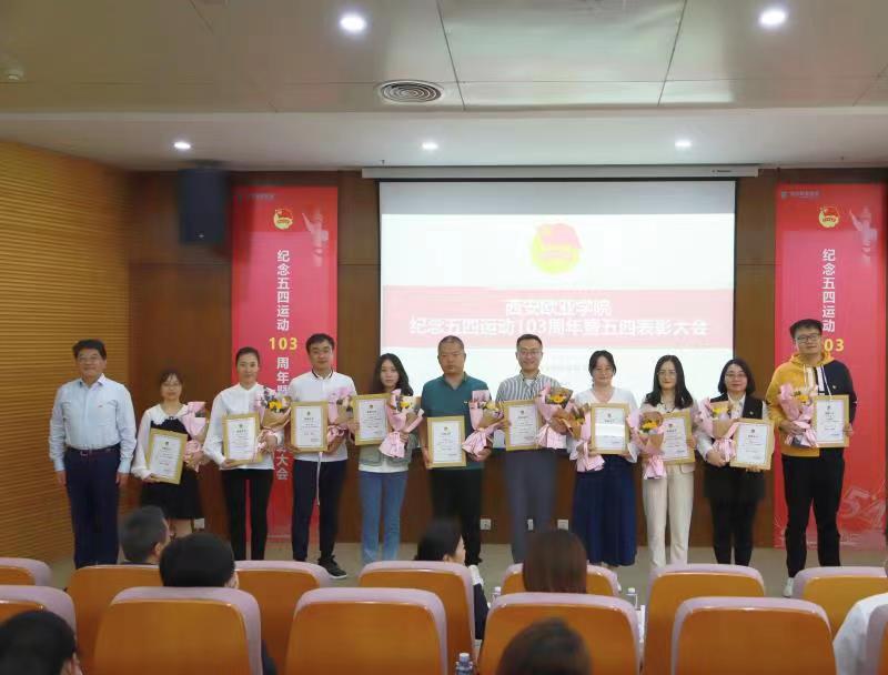 在副校长张军宏老师宣读完表彰决定后大会进入颁奖议程:主持人董杨老师依次邀请颁奖嘉宾上台为获奖集体和个人颁奖,校党委书记于孟晨教授颁发“五四青年奖章”奖,校党委副书记、校长刘瑾教授颁发“五四红旗基层团委”,副校长张军宏老师颁发“五四红旗团支部”奖,会计学院院长谢涛老师颁发“优秀共青团干部”奖,文化传媒学院院长助理曹小娟老师颁发“优秀共青团员”奖,高职学院副院长高鹏老师颁发“优秀志愿者”奖,学工部副部长张成老师颁发“优秀学生干部”奖,第四青年社区分党委书记李嘉瑜老师颁发“荣誉学生”奖。