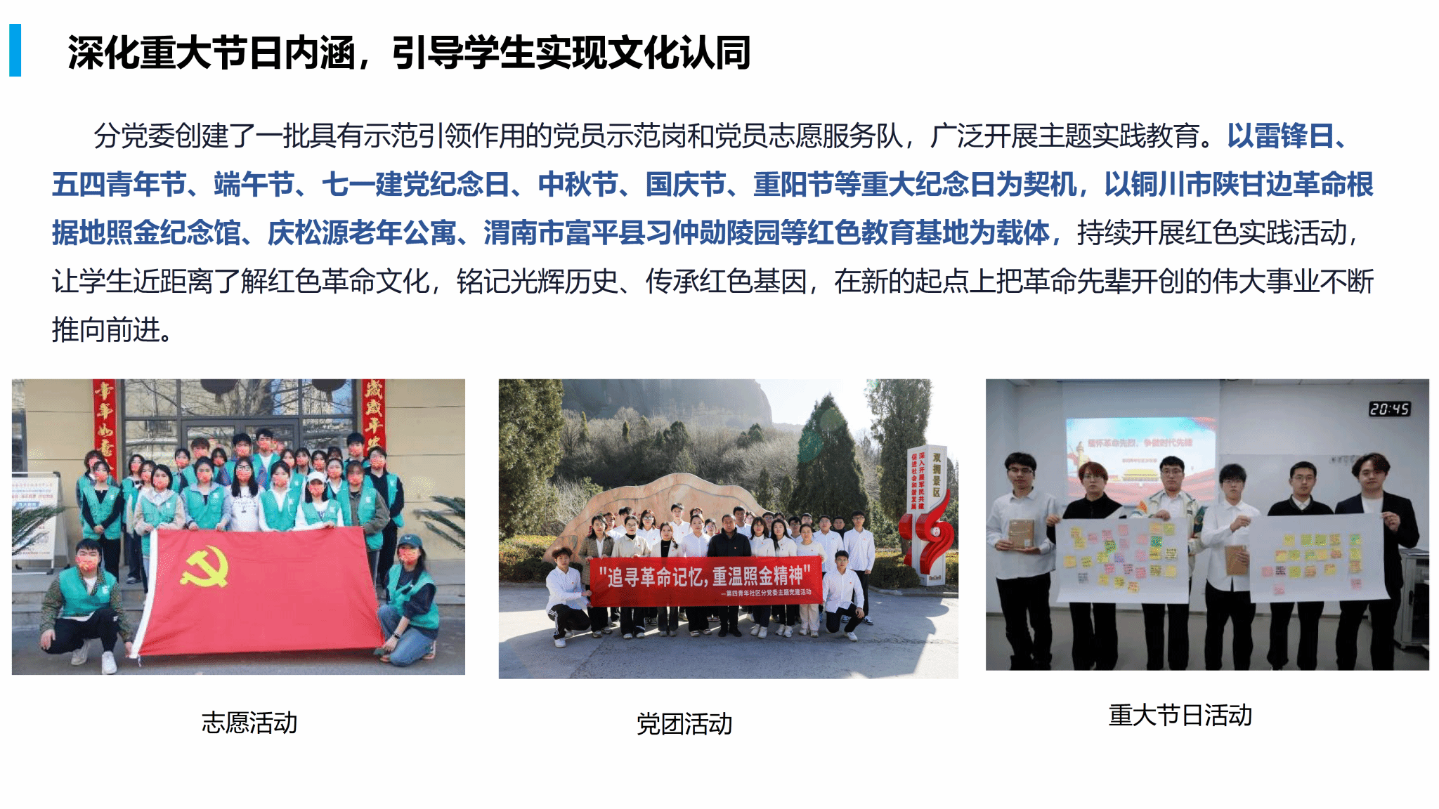 分党委创建了一批具有示范引领作用的党员示范岗和党员志愿服务队,广泛开展主题实践教育。以雷锋日、五四青年节、端午节、七一建党纪念日、中秋节、国庆节、重阳节等重大纪念日为契机,以铜川市陕甘边革命根据地照金纪念馆、庆松源老年公寓、渭南市富平县习仲勋陵园等红色教育基地为载体,持续开展红色实践活动,让学生近距离了解红色革命文化,铭记光辉历史、传承红色基因,在新的起点上把革命先辈开创的伟大事业不断推向前进。