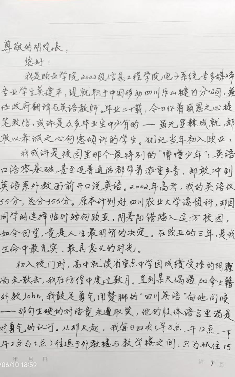 莫建平写给胡校长的信
