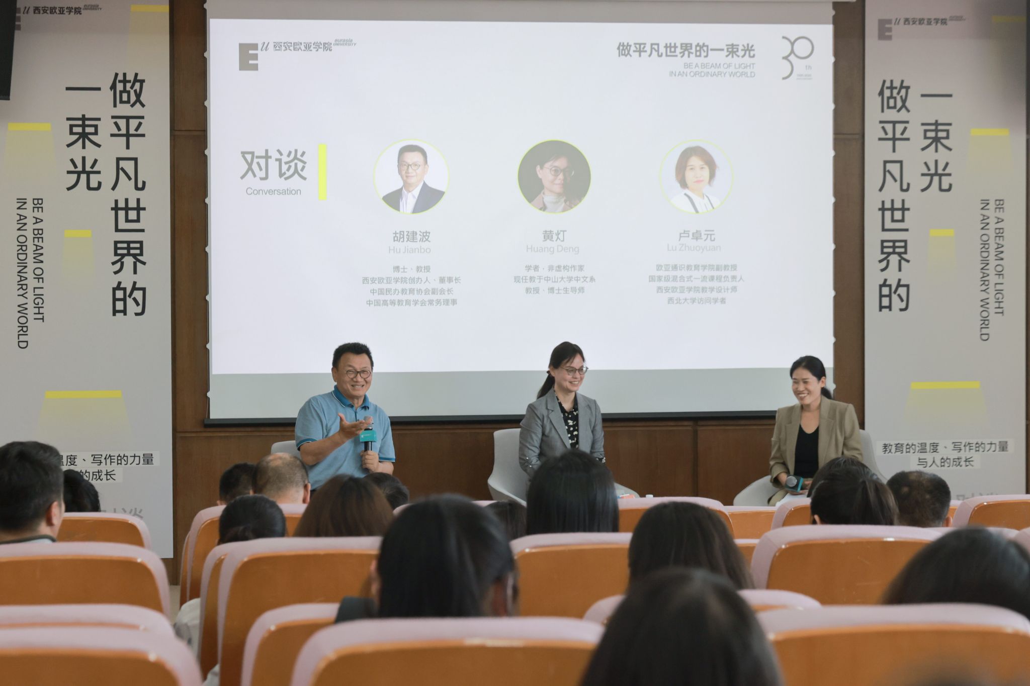 那么我们内心想要的是什么呢?黄灯老师写了《我的二本学生》来指出问题。我在二十年前写了一本书,叫做《教育的偏见》,“偏见”二字并不带有立场,而是说我对教育这件事有着和当时的主流不太一样的见解。三年前,欧亚校史出版,定名为《按你本来的样子生长》,表达我们对于教育变革的一种勇敢的追求,以及欧亚倡导做自己的价值主张。今年我自己的第三本书《做平凡世界的一束光》即将出版,我认为在教育哲学层面,欧亚的办学实践与黄灯老师是完全一致的。