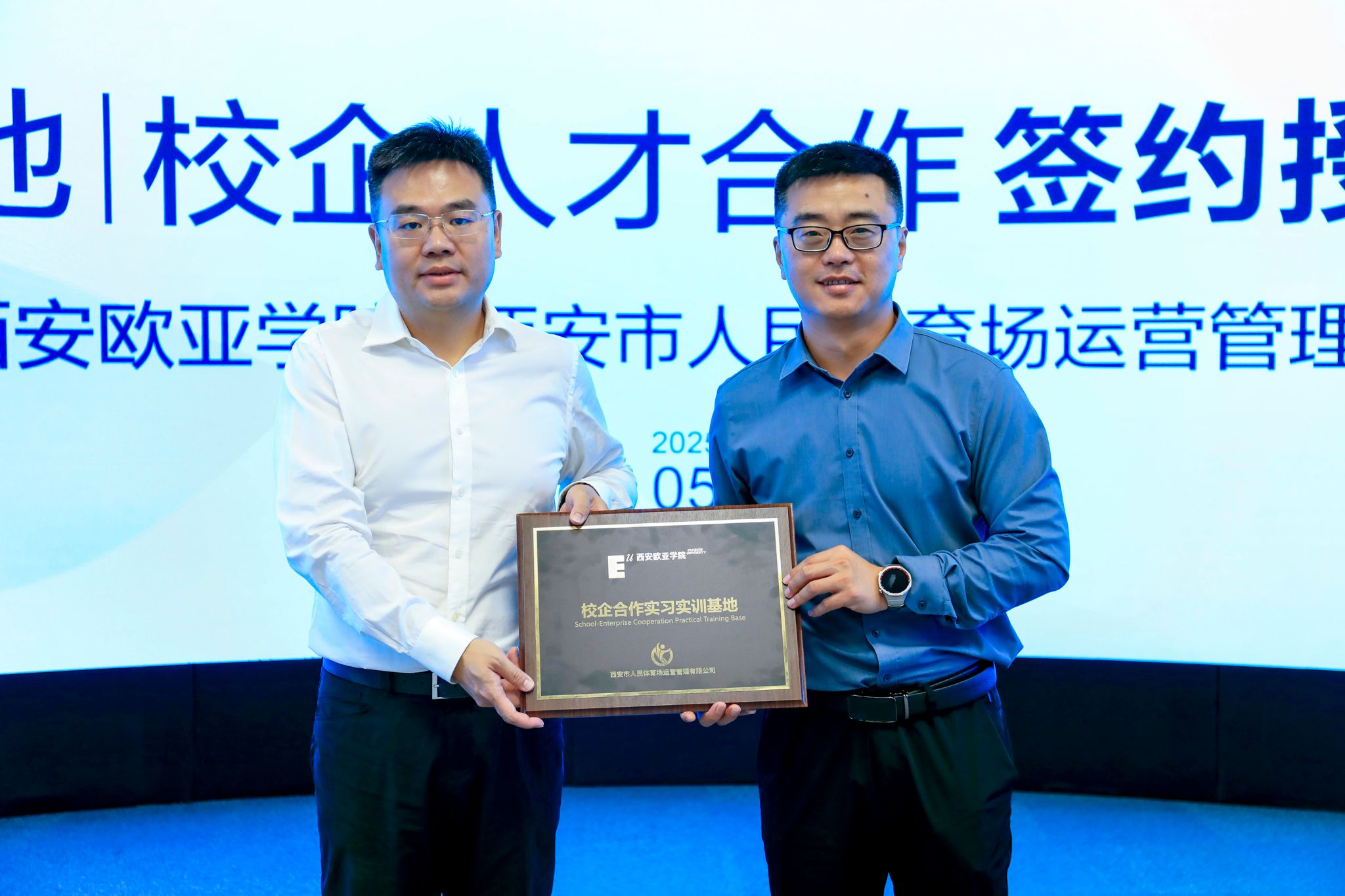 仪式现场,西安城投文体产业运营管理有限公司副总经理夏新荣与beat365手机版官网职业教育学院副院长段永刚代表双方签署战略合作协议,明确在人才共育、资源互通、科研共创等领域的合作细则,并互授“校企合作人才培养基地”和“校企合作实习实训基地”牌匾。