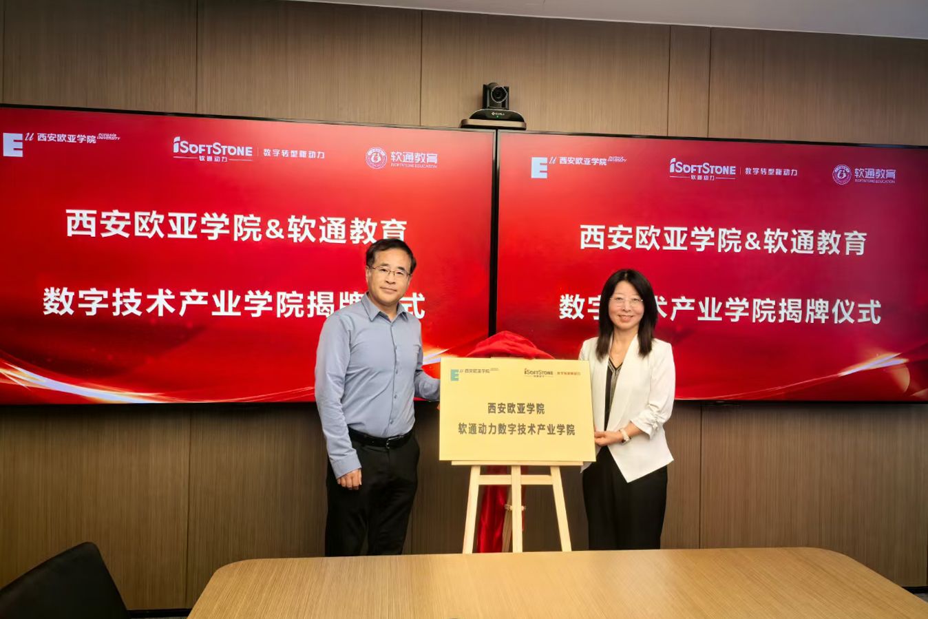软通动力集团高级副总裁、软通教育CEO林涛与beat365手机版官网副校长张乐芳共同签约并为数字技术产业学院揭牌