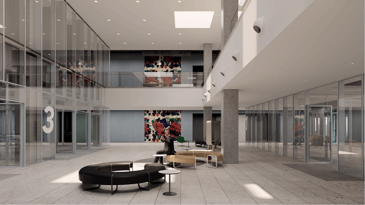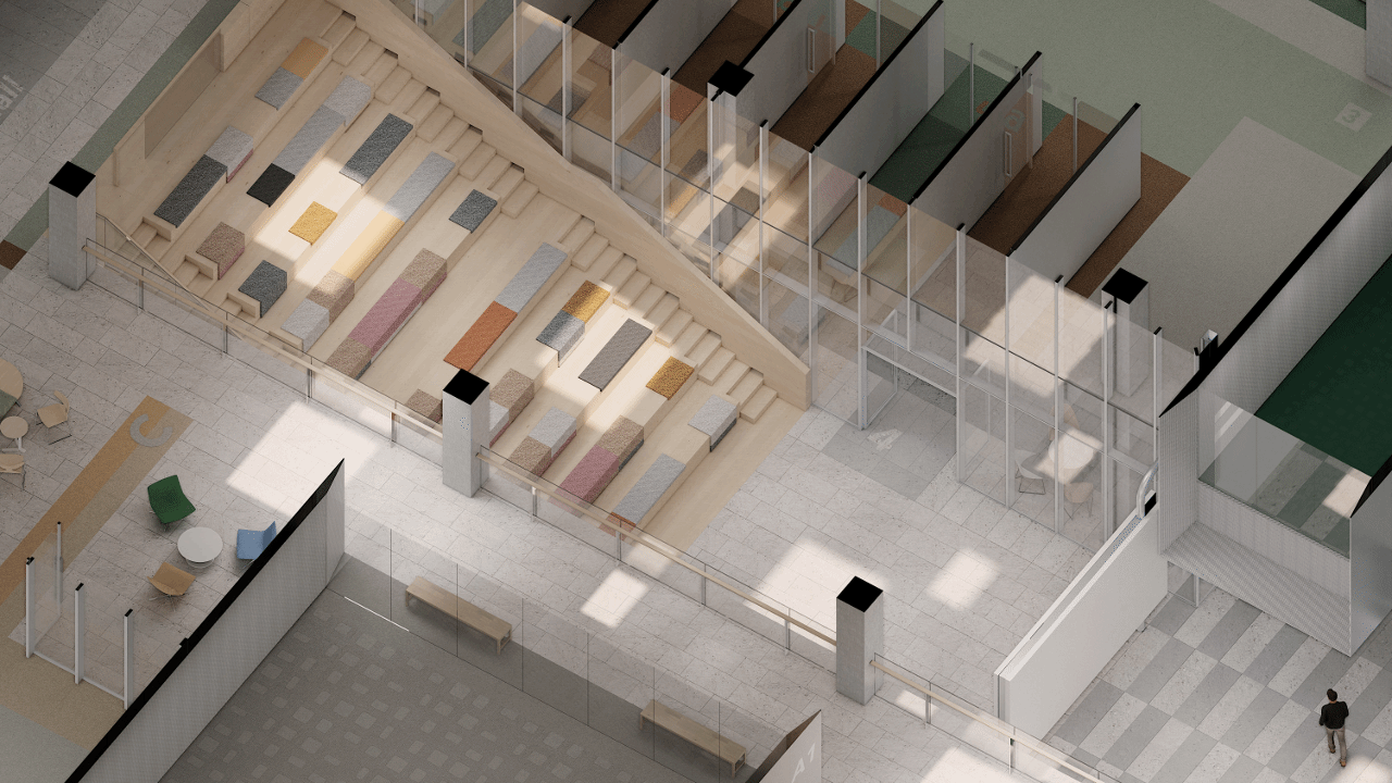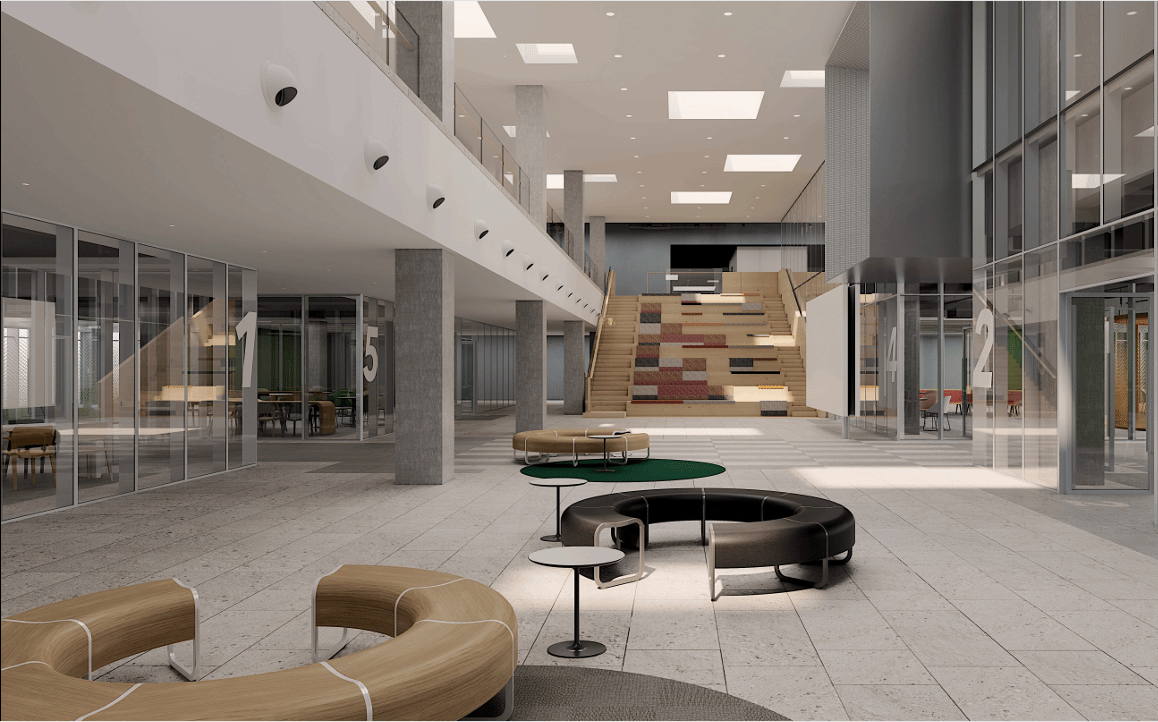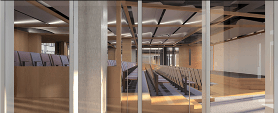 两层裙楼中设有公共中庭、大阶梯等装置