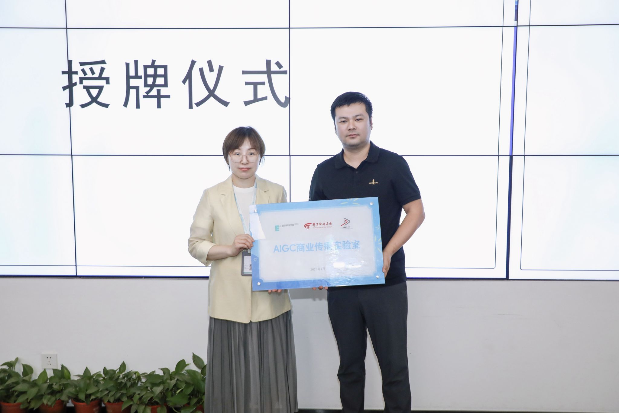 活动现场举行了华商数字文旅产业研究院与beat365手机版官网共建“AIGC+商业传播”实验室授牌仪式,华商数字文旅产业研究院副院长马广浩、文化传媒学院新闻学专业主理人徐思共同为实验室建立授牌。华商数字文旅产业研究院秘书长户文颖向文化传媒学院捐赠华商传媒AIGC教育舆情产品,旨在为师生提供先进的AI工具支持,助力教学与科研创新。
