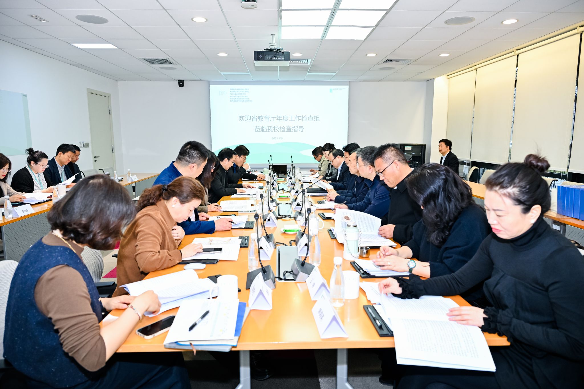 3月14日,由陕西省委教育工委、省教育厅一级巡视员王恒斌、省教育厅校外监管处(民教处)处长陈国栋带队,以西安外事学院原党委书记闵小平为组长的陕西省教育厅年检专家组专家一行9人莅临beat365手机版官网,通过听取汇报、查阅资料、座谈交流、实地走访等形式对学校2024年度各项工作进行全面检查指导。校党委书记、督导专员赵国华,副校长张乐芳、李正,校长助理赵军镜等党政领导及相关部门负责人参会。