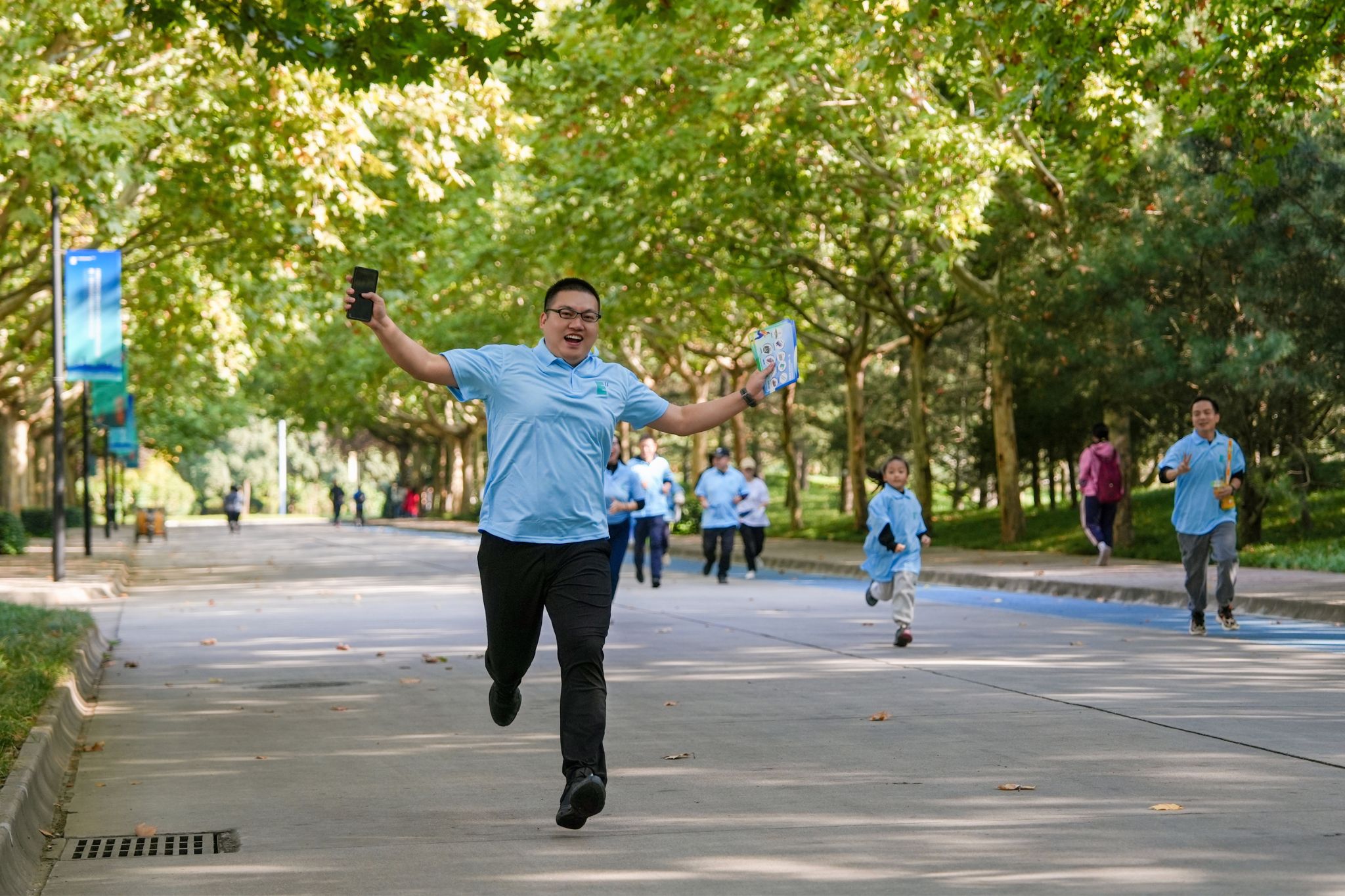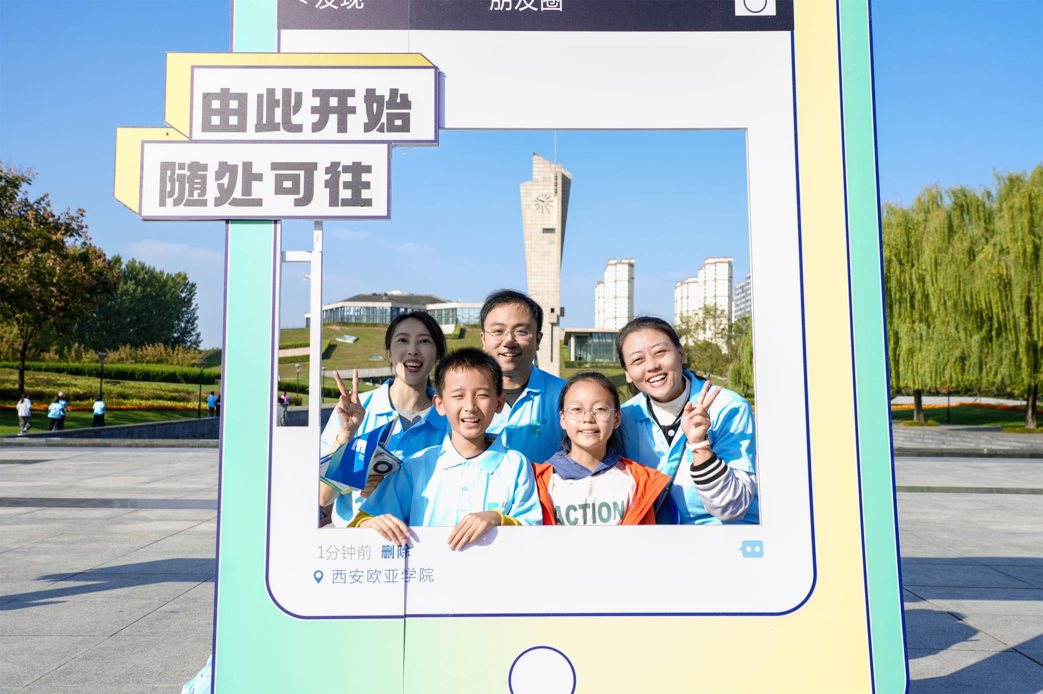 分组、热身,校友们整装待发。随着发令枪响,大家如同奔腾的溪流,沿着规划的赛道向前奔跑。从情人坡上的飞盘竞技,到东大门广场的拍照打卡,再到图书馆正门的对诗挑战,每一个活动地点都留下了校友们的欢声笑语。一道道矫健的身影,仿佛穿越时光,重现了他们当年在校园里的青春活力。东大门广场的“欧亚记忆”打卡点大受欢迎,随着相机快门的落下,成功定格了一个个美好的瞬间。