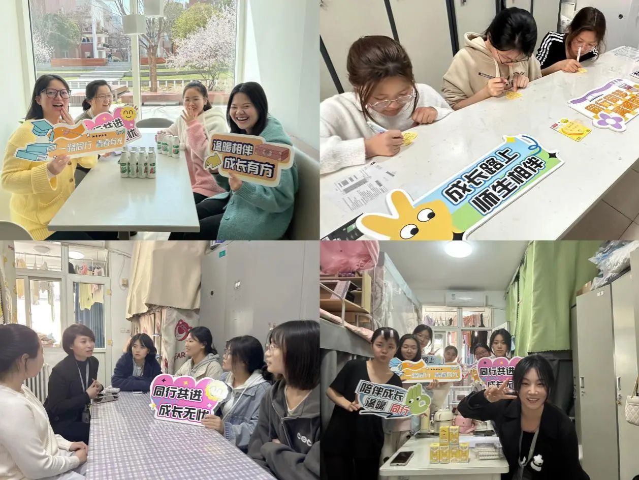 高年级辅导员们则是更加关注学生在学业成长、习惯养成方面的困惑。刘姜伟老师在虹桥碎石广场与同学们交谈,鼓励同学们走出宿舍,在校园里发现春的印记,用自己的双眼和镜头留住风景,用双脚丈量世界;赵锦瑶老师从女生宿舍的瓶瓶罐罐里与大家交流宿舍收纳技巧,学生们也提供了不少宿舍收纳小妙招,招招出奇制胜;张爱荣老师则让自己的学生们更加关注实习实践机会,为大四阶段的学习实践做好准备。