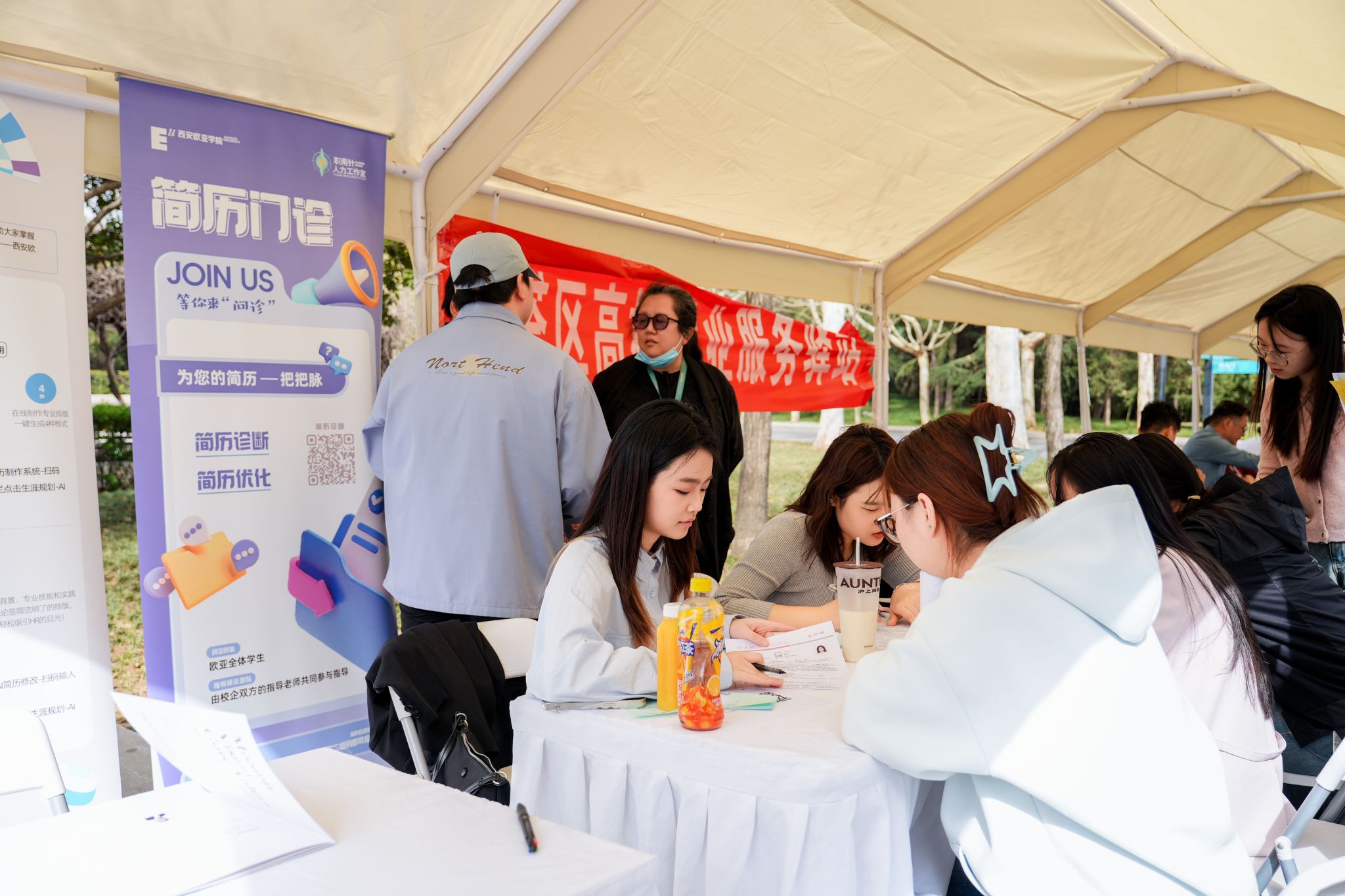 “简历门诊”展位前,生涯辅导老师为毕业生们提供“一对一”简历修改、面试辅导、心理调适、职业规划等全方位就业服务,帮助学生答疑解惑,满足学生多样化的就业及职业发展需求。