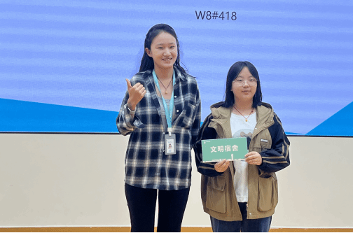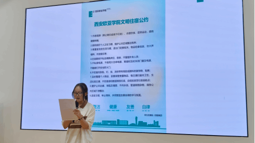 宿舍作为承载日常生活的一席空间,既装载生活的平淡与喜乐,又让梦想生长绽放。青年社区共享价值观的践行更是为文明宿舍创建及塑造学生良好行为习惯提供了行动方案。大会第四项,文明宿舍代表Queens’land青年社区W2#513白文婧同学发言。白文婧同学结合整洁、健康、友善、自律的价值理念,分享了她们宿舍践行的小故事,引发了全场师生们的共鸣。在分享结束时,她强调到舍友应相互帮助,相互包容,才能收获友善的宿舍氛围。