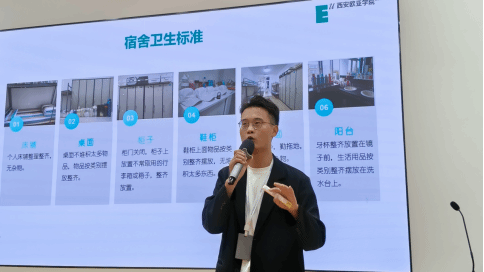 著名管理学家彼得·德鲁克曾说过:“我的目标就是要建设一个人性化的环境,让人们都能昂首挺胸的生活”。欧亚为青年社区定制了专属社区共享价值观“整洁、健康、友善、自律”。在宿舍,整洁友善的宿舍氛围,健康自律的生活习惯,需要同学们共同守护。大会第一项,社区主管助理王雪辰老师为学生带来精彩且详尽的文明宿舍卫生标准培训。王老师从宿舍的床铺、桌面、柜子、地面等八个方面详细讲解了整洁干净的标准,使在场的同学对卫生标准有了更加深入的理解。同时他与现场同学进行互动,了解学生对于培训结果的反馈。