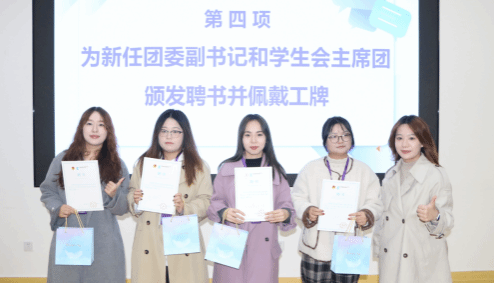 团委副书记慕鸾言,毕俞殊为新任部长颁发聘书并佩戴工牌,各部门部长为新干事们佩戴工牌并赠与礼物,工牌的交递不在于股掌之间,更在于使命的接踵与心的交互。