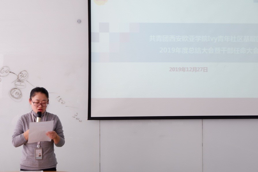 首先,大会由校团委书记董杨老师进行致辞,董老师表示,希望Ivy青年社区的广大青年团员们能够积极学习党团理论知识,加强对共青团的认识,提高自身政治素养;同时也要确立目标、坚定理想,明确自己为之奋斗的方向,不要因为走得太远而忘记团队最初的目标;此外,希望基层团委的成员们能够成为学生群体中的优秀代表,能够成长、成才,为党和国家注入新鲜的血液。