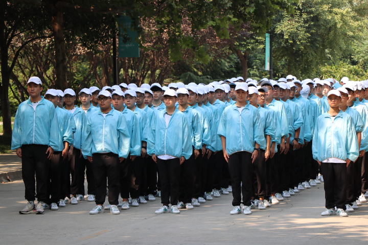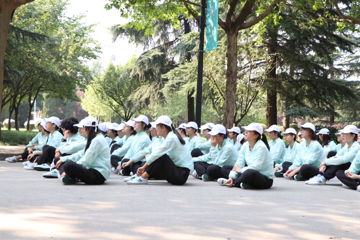 小编发现新生们都很认真地踢正步、站军姿、练习走方队