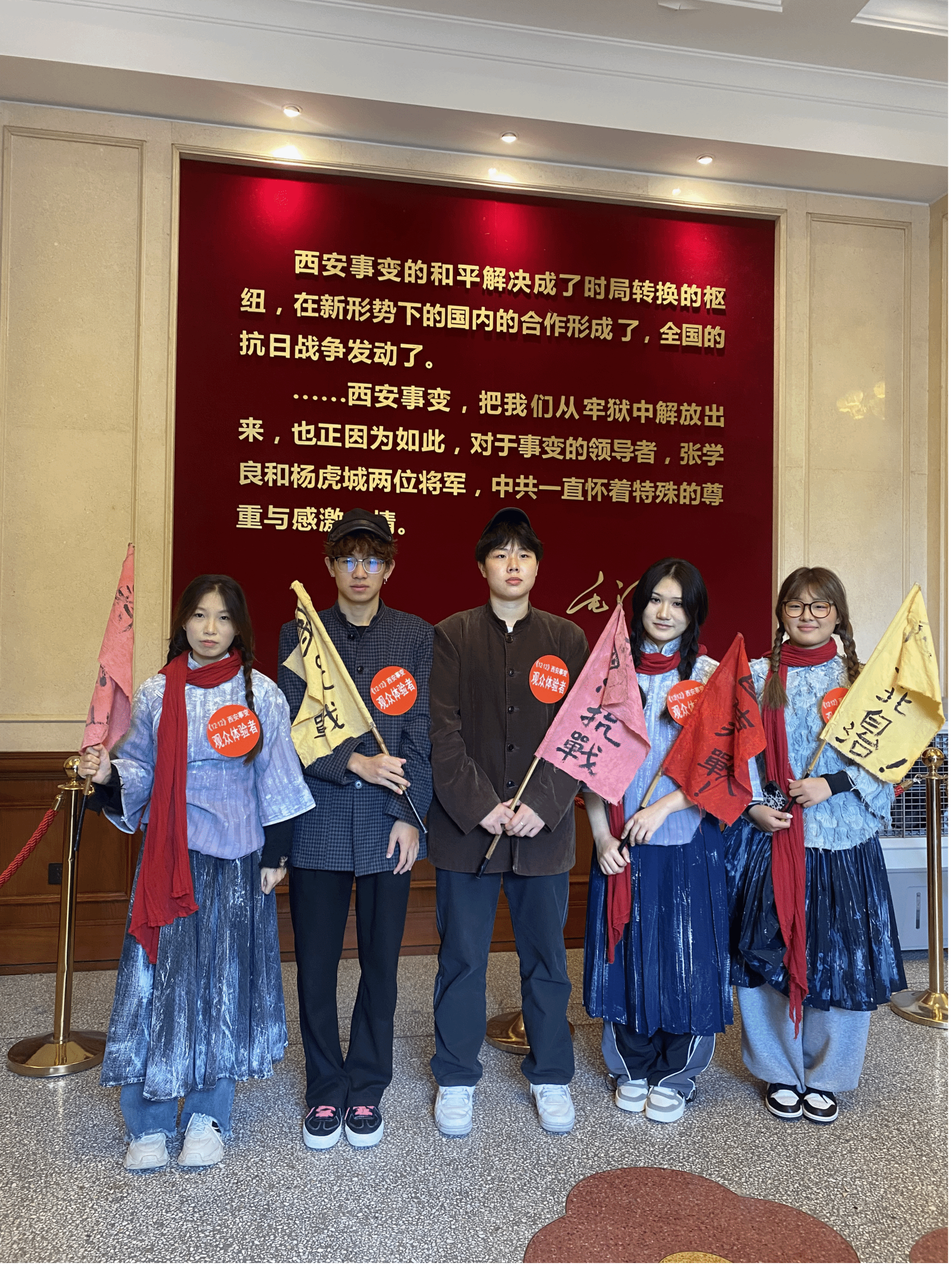 华清宫的亭台楼阁间,百年前的历史风云仿佛触手可及。学生们身着民国风格服饰,手持旗帜,走进《1212西安事变》演出的瑶光阁剧场。随着大幕拉开,先进的舞台技术与演员的精彩演绎,将1936年冬日那个惊心动魄的夜晚——张学良、杨虎城两位将军发动“兵谏”、“逼蒋抗日”的历史瞬间,立体地呈现在众人眼前。