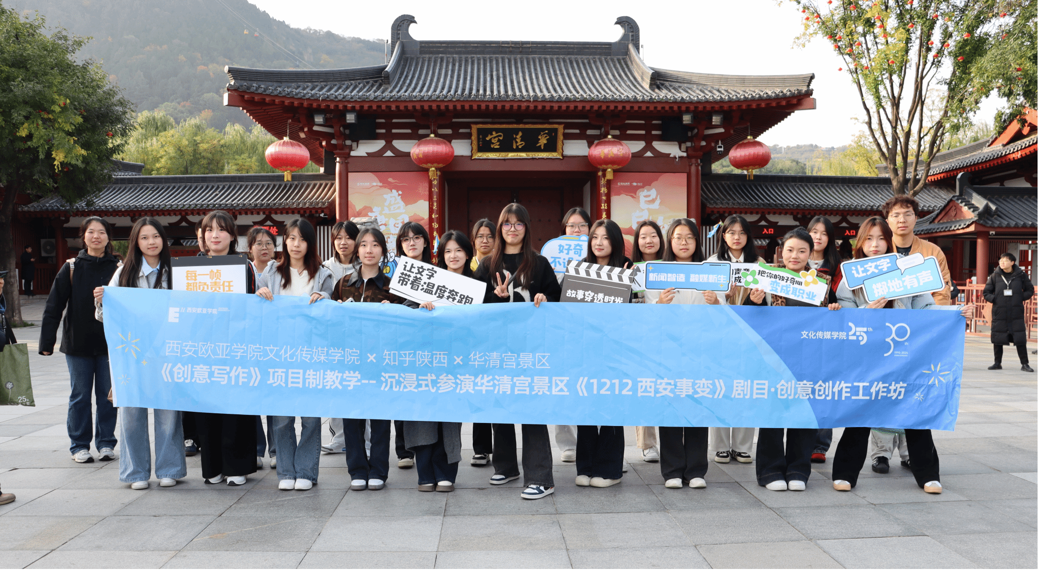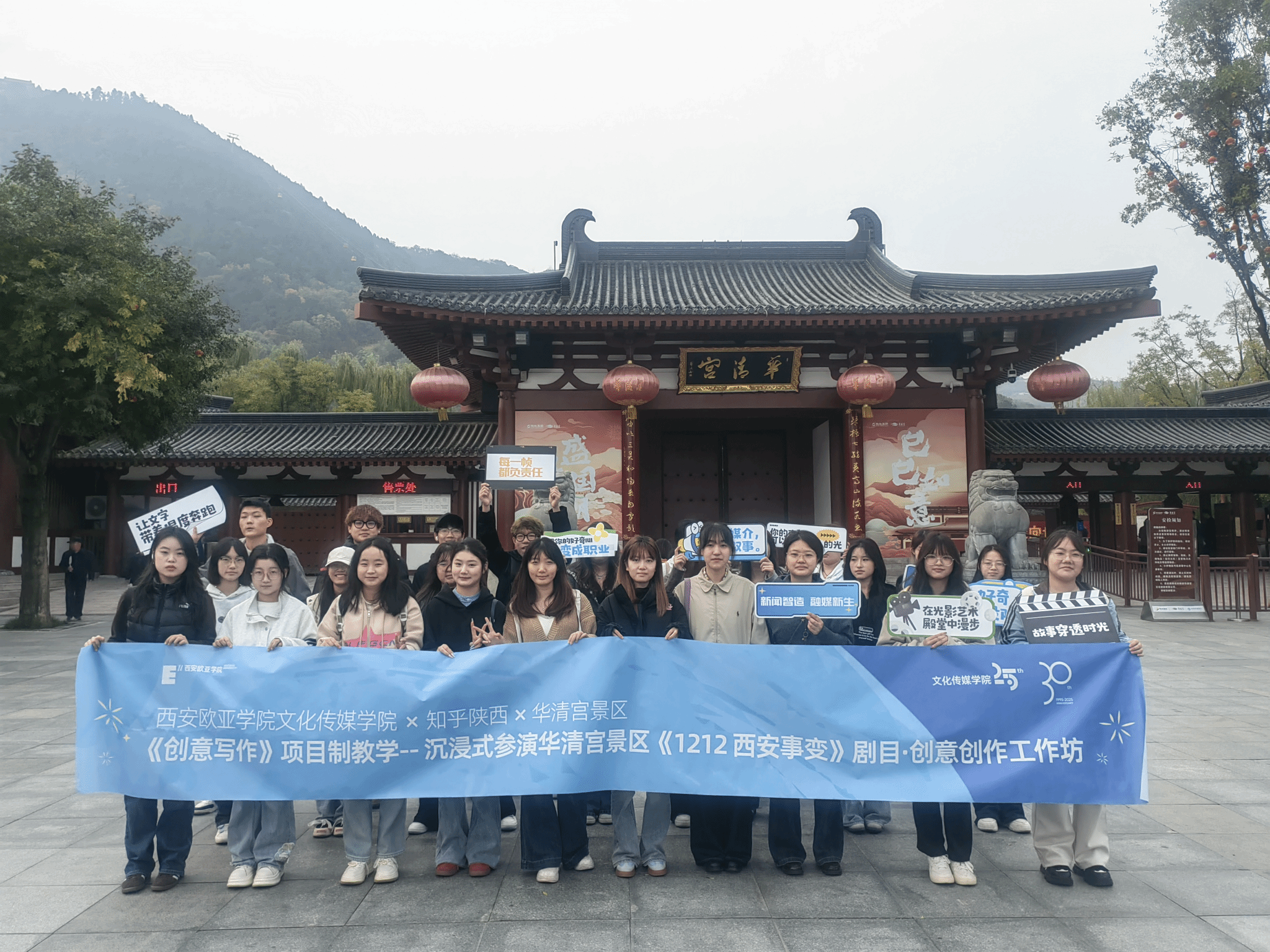 10月30日至11月1日,beat365手机版官网文化传媒学院新闻学专业联合知乎陕西运营中心、华清宫景区,组织新闻学2024级学生走进华清宫景区,开展了一场别开生面的《创意写作》课程实践教学活动。本次活动以国家级文旅IP——《1212西安事变》沉浸式影画剧目为载体,通过“沉浸式参演+创意内容转化”的项目制教学、工作坊教学模式,让学生从“旁观者”变身“参与者”,在历史现场激活五感,在创意实践中重构叙事,实现“历史活化”与“Z世代叙事创新”的双向奔赴。