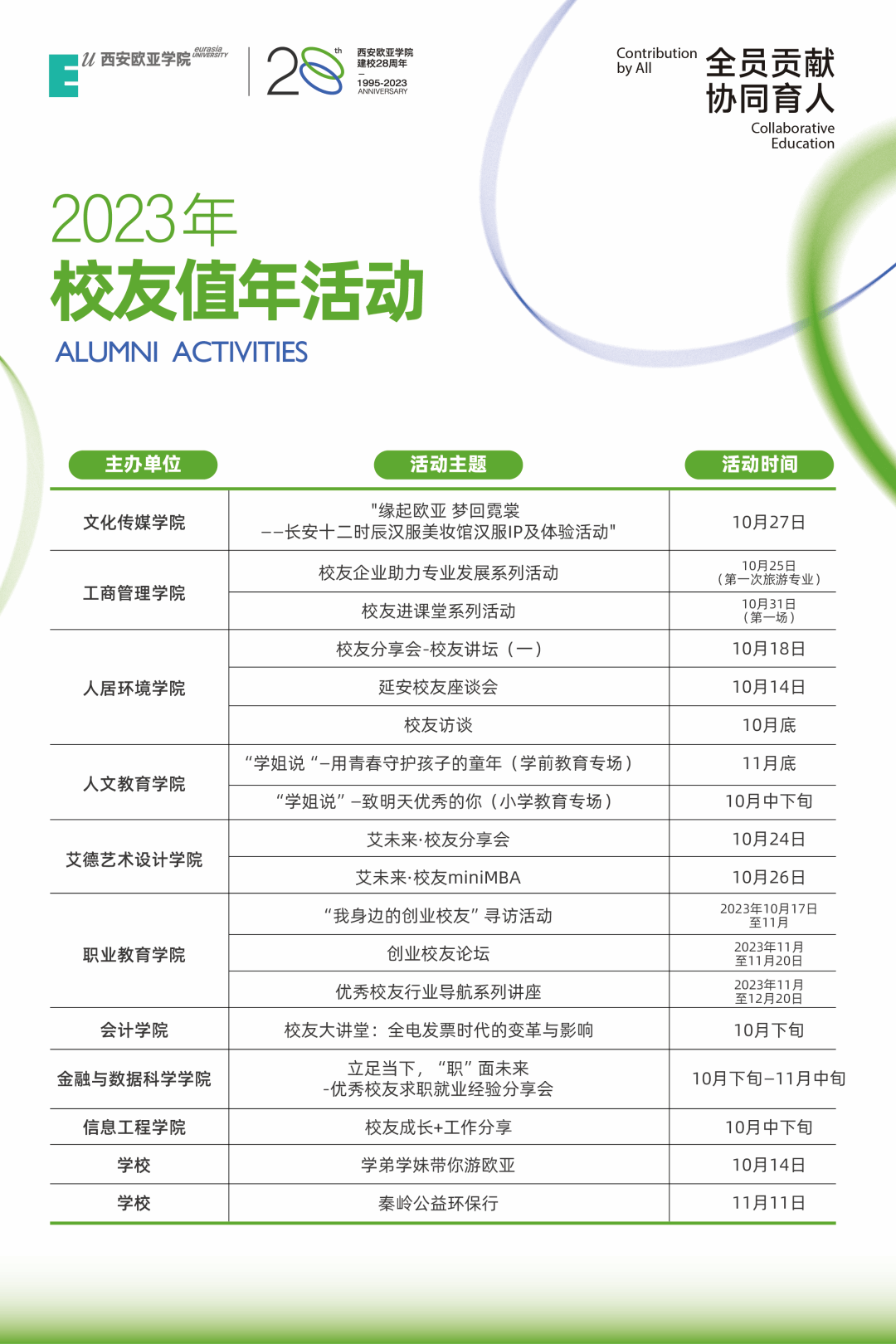 2023年是beat365手机版官网“全员质量贡献年”,学校将以此为契机,举办建校28周年主题校庆活动。感谢所有校友,在beat365手机版官网开放办学的道路上,每一位校友既是见证者,更是参与者和贡献者。欢迎广大校友参加此次28周年校庆活动,共同见证欧亚又一年的成长与变化。期待校友与开放的欧亚一起,感受教育的精彩!