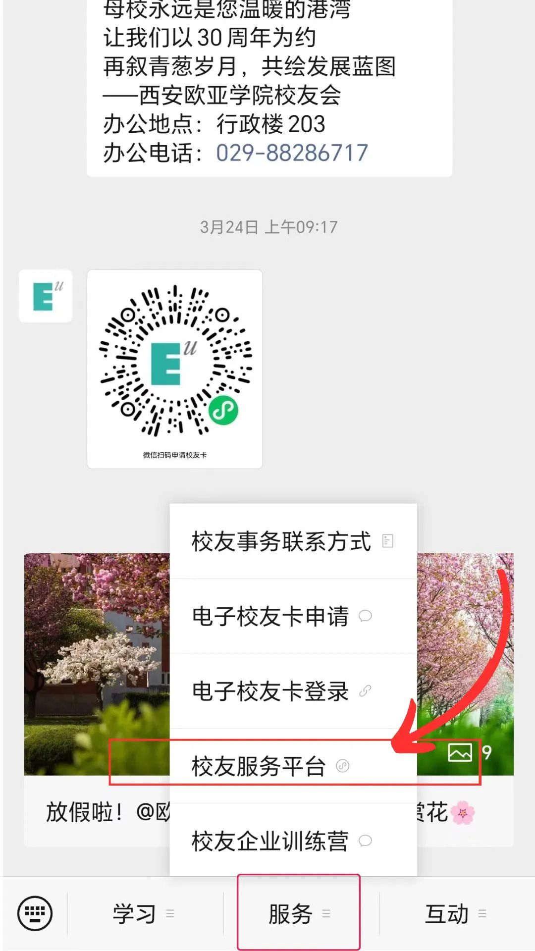 2.点击公众号【服务】中的【校友服务平台】。