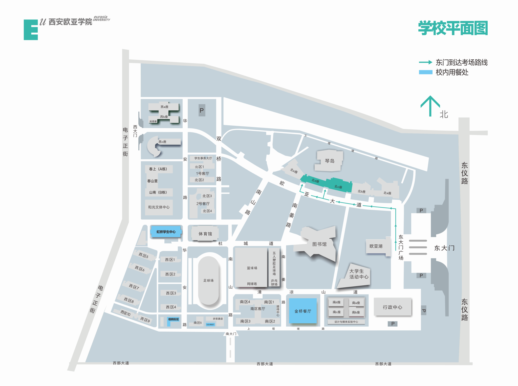 beat365手机版官网考点位于陕西省西安市雁塔区东仪路8号,请各位考生从beat365东门进入,考场位于教学北区C、D座教学楼。因进入考试封闭区和考场时需要接受智能安检、存放物品以及身份验证,请考生至少提前1小时到达考点,留足入场检查时间,以免影响考试。考试楼宇位置及进校路线见下图