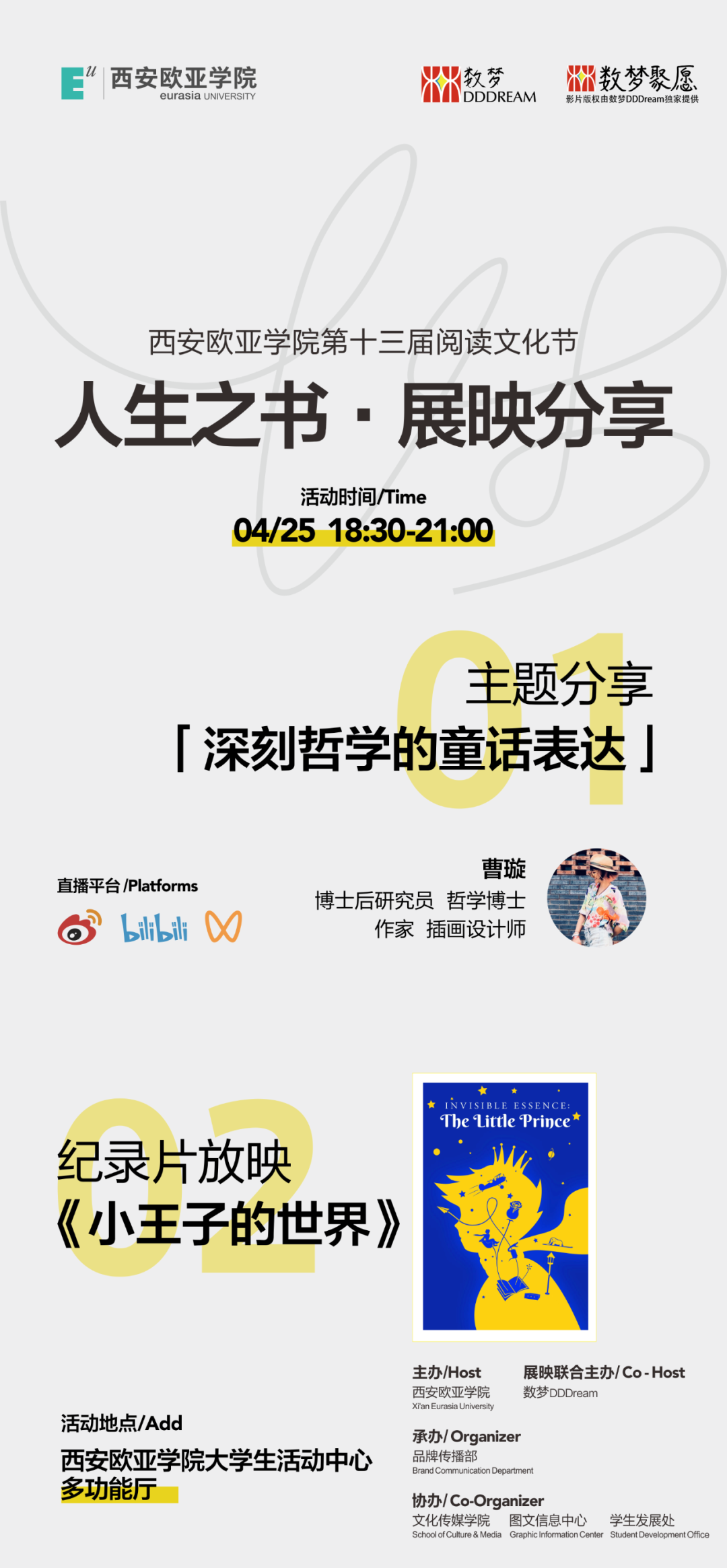 “每个人的心中都有一个小王子”,此次,我们将展映《小王子的世界》,并伴随“深刻哲学的童话表达”主题分享,解读圣·埃克苏佩里的精神内核,感触那些一语道破人生真谛的童话哲学。
