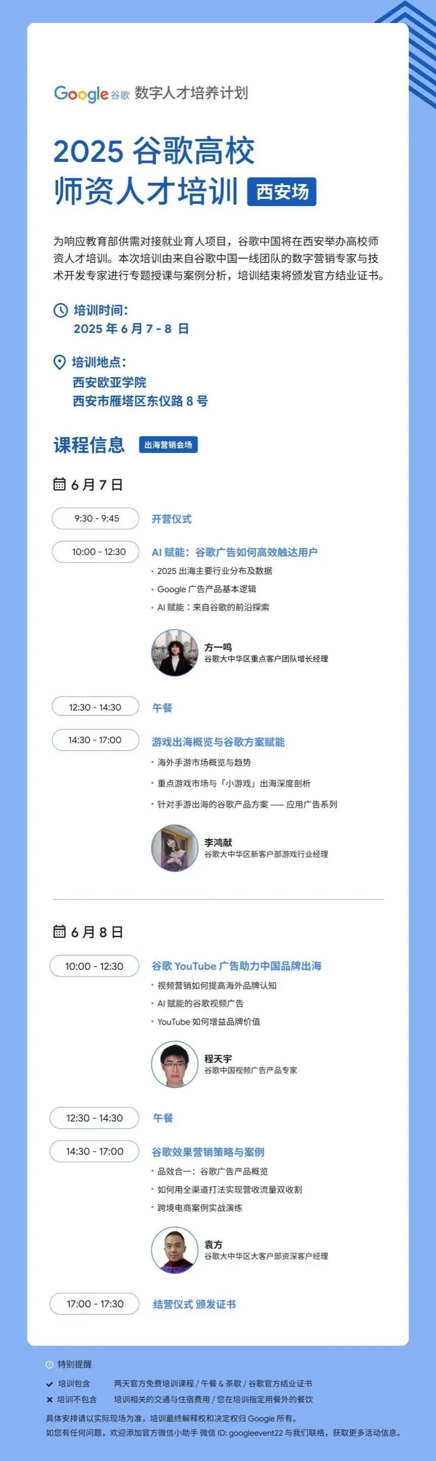 一线专家授课: 由谷歌中国一线团队的数字营销专家与技术开发专家联袂主讲。实战案例驱动: 结合丰富实操案例,从理论到实践深度解析。官方权威认证: 培训结束将颁发谷歌官方结业证书,助力您的专业发展。本次培训旨在赋能高校教师,期待将最前沿的数字营销理念、工具与实践融入教育教学,培养更具职业竞争力的国际化数字人才。
