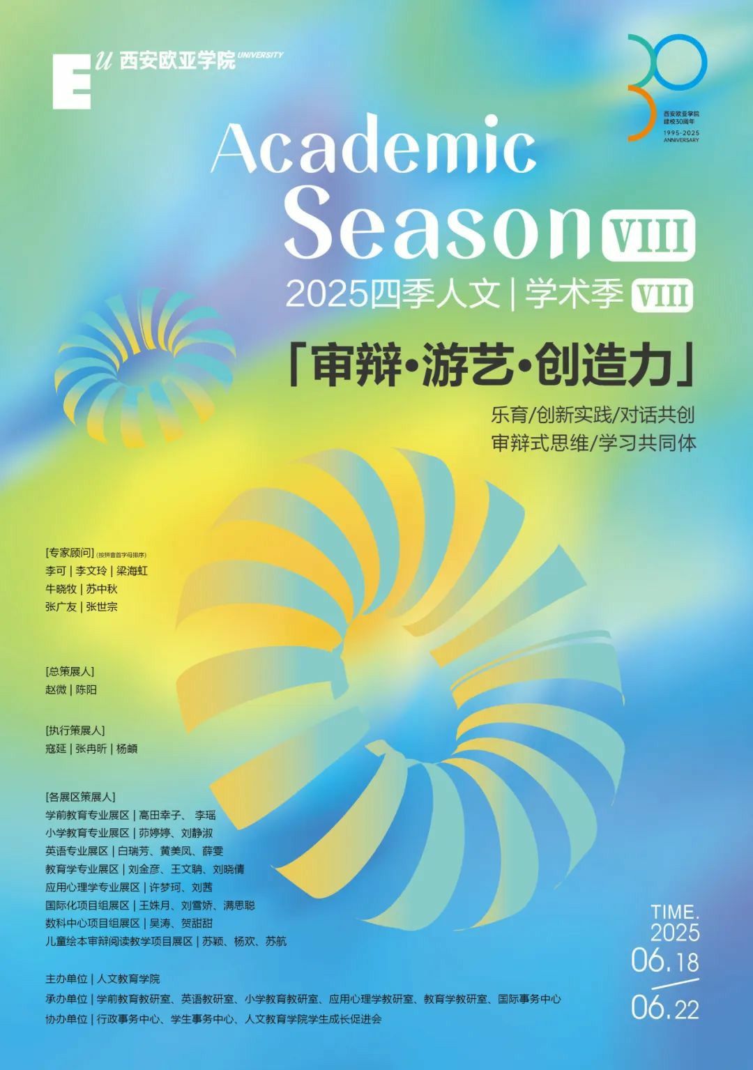 学术季期间,将有来自国内外高校的专家、教授及省内外中小学、幼儿园、教育场馆、教育集团及机构等30余家行业知名学校的校长、园长和管理人员齐聚欧亚,并担任评价嘉宾,指导学生们在学习——实践——反思的过程中,加深行业理解,沉淀专业素养,共同培养面向未来,独立思考、勇敢创新、力行担责的教育行业新生力量。
