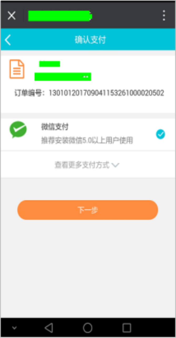 第五步:显示微信支付,点击“下一步”,输入微信支付密码,完成支付。