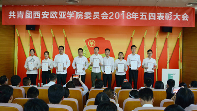 (图一)全体人员起立奏国歌 (图二)学生发展处处长周岚致辞 (图三)校团委书记、学生发展处副处长董杨同志宣读表彰决定 (图四)校党委书记许尚年同志上台讲话 (图五)第一青年社区团委副...