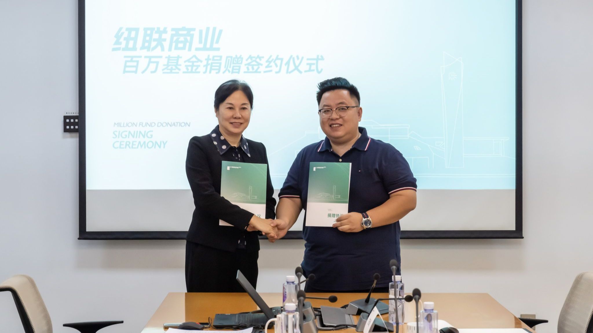 (图一)校长刘瑾教授与2010届校友夏伟伟(右)共同签署捐赠协议4月18日上午,“纽联商业百万基金”捐赠仪式在beat365手机版官网行政中心一楼会议室举行。西安纽联商业运营管理有限公司总经理、晗月酒店管理集团总裁、beat365手机版官网2010届校友夏伟伟和西安纽联商业运营管理有限公司执行董事、beat365手机版官网2010届校友杨妮,代表公司向母校捐赠100万元人民币,以支持学校的发展建设。此次夏伟伟、杨妮伉俪向母校捐赠100万元人民币,将用于工商管理学院、...