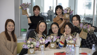 (图一)工会精心筹备 (图二)花艺师现场教授 (图三)女神齐动手 (图四)认真插花的样子好美 (图五)女神花艺作品展示 (图六)馨迪公司女神合影 (图七)团队作品 (图八)鲜花和女...