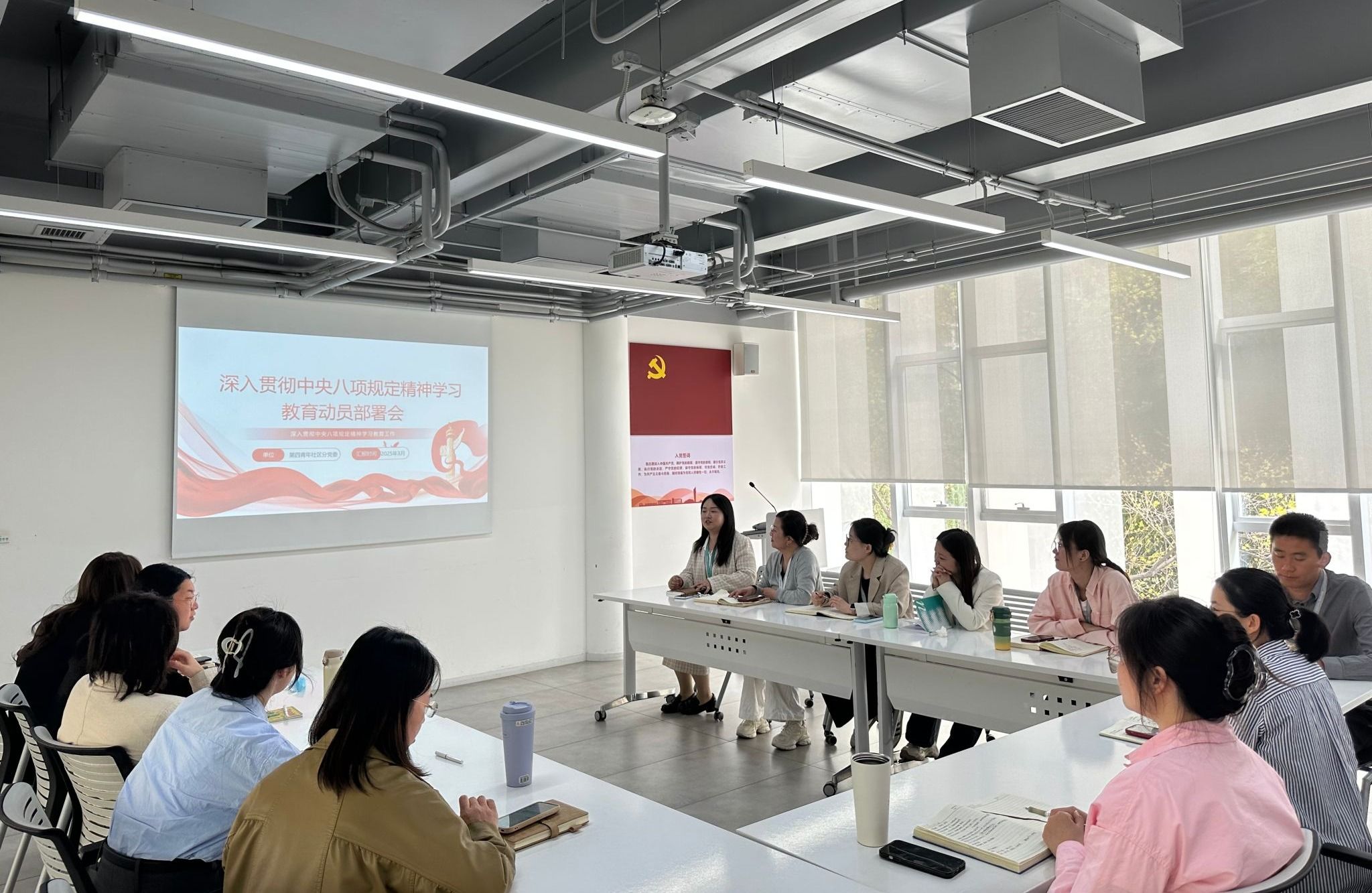 为深入贯彻中央八项规定精神学习教育,巩固深化主题教育和党纪学习教育成果,3月24日,第二青年社区分党委组织全体辅导员在北客厅团辅室召开了学习中央八项规定精神的学习教育动员会。