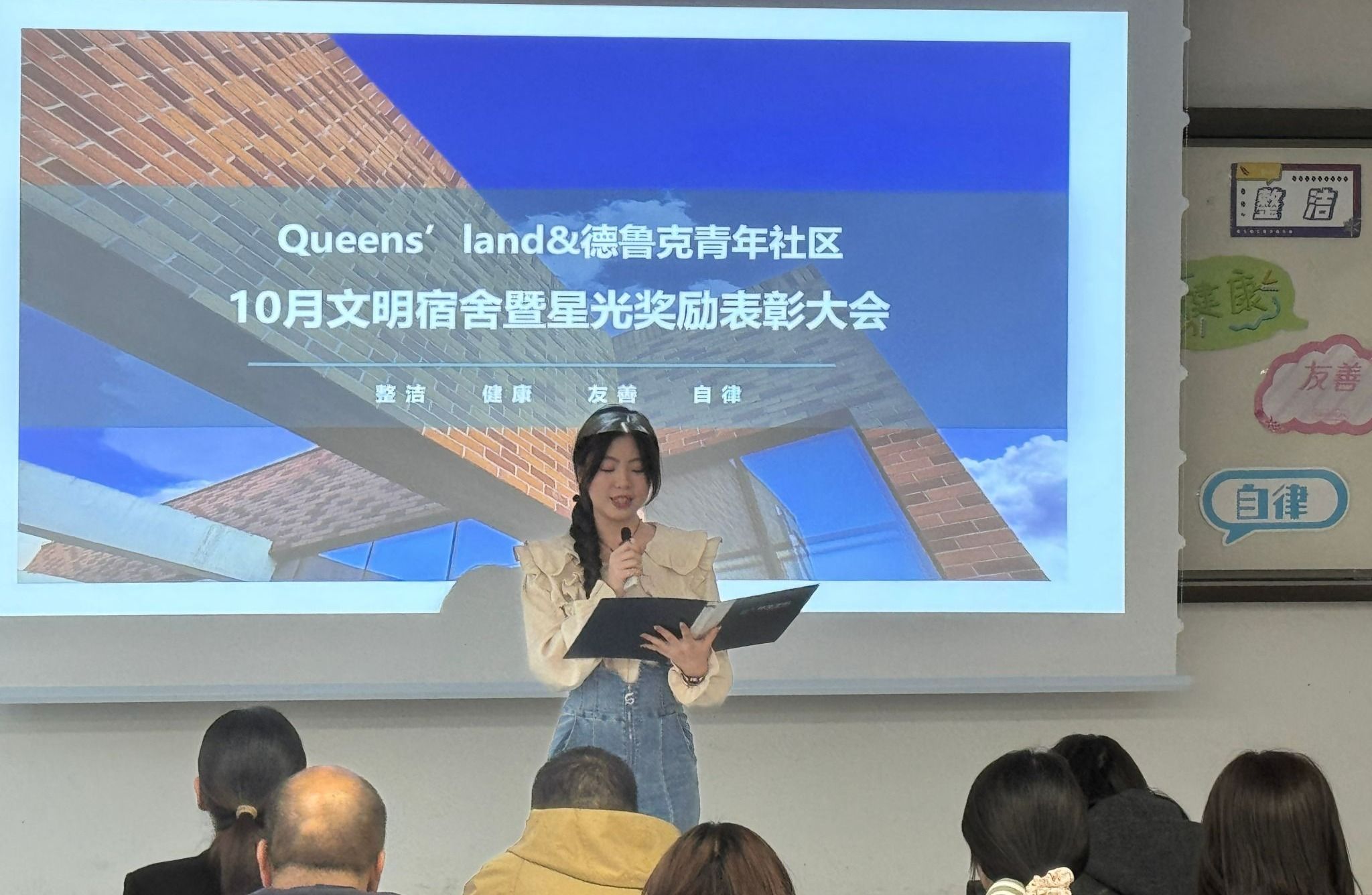 立冬悄然而至,2024年11月7日立冬这一天,寒意渐浓,但在北C308却洋溢着温暖与热情。Queens’land和德鲁克青年社区100余名师生齐聚于此,共同迎来了10月文明宿舍暨星光奖励表彰大会。本次大会由Queens’land青年社区杨昕曈同学主持。杨昕曈同学主持表彰大会大会第一项,杨文璐老师宣读表彰决定。结合9月21日-10月20日社区、公寓检查的5次卫生数据统计,按月选出了优秀率大于等于75%的优秀宿舍,本月共有59间宿舍获得文明宿舍荣誉称号。...